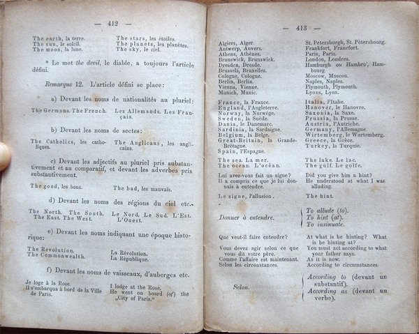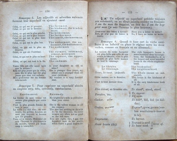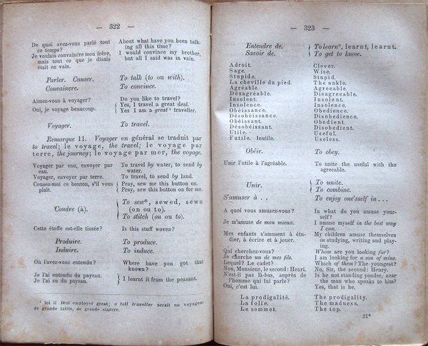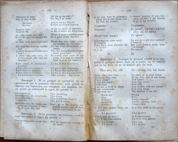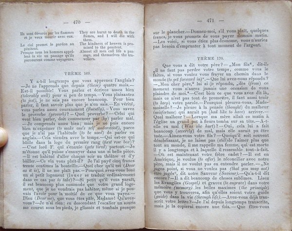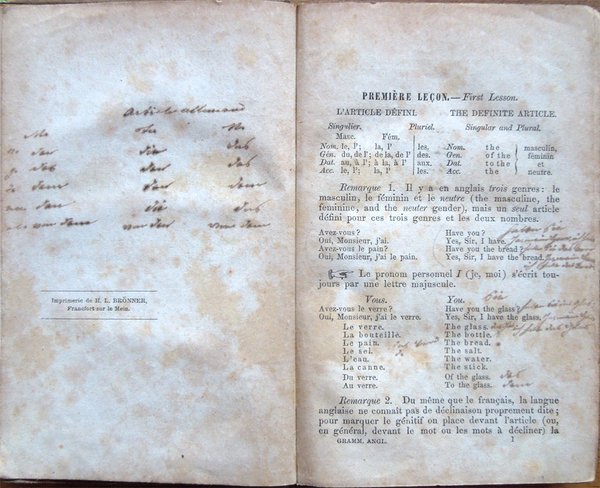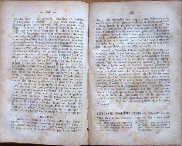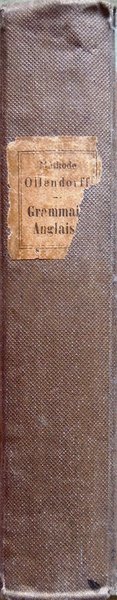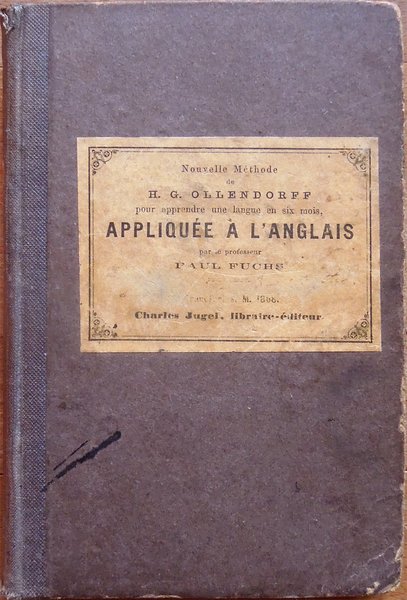 In-16° (17,6 x 11,4 cm), pp. (6), 664, legatura editoriale in mezza tela con titoli su tassello in carta al piatto anteriore e al dorso. Qualche normale segno d'uso e del tempo alla legatura, in particolare: ai piatti, abrasioni alla carta dei labbri; una piccola rottura della tela alla cuffia superiore e, sempre al dorso. mancanza di parte del tassello in carta. Scritte, di mano coeva, al verso del foglio con al recto il frontespizio e a pagina 1. Alle pagine, segni d'umido e normale patina del tempo, con arrossature dovute al tipo di carta. Per il resto, in buono stato. Titolo completo: Nouvelle méthode de H. G. Ollendorff pour apprendre une langue en six mois, appliquée à l'Anglais. Ouvrage original et entierèment neuf à l'usage de tous les établissements d'instruction publics et particuliers, publié par le professeur Paul Fuchs, auteur de plusieurs grammaires d'après la méthode Ollendorff.