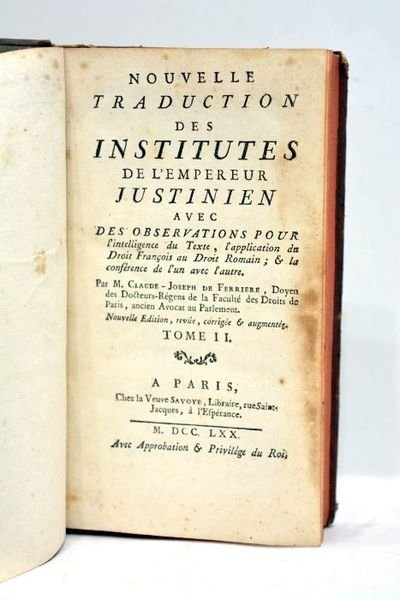 Nouvelle traduction des Institutes de l'Empereur Justinien, avec des observations pour l'intelligence du Texte, l'application du Droit français au Droit Romain; et la conférence de l'un avec l'autre, par M. Claude-Joseph de Ferrière. Nouvelle édition, revue, corrigée et augmentée. Tome II.