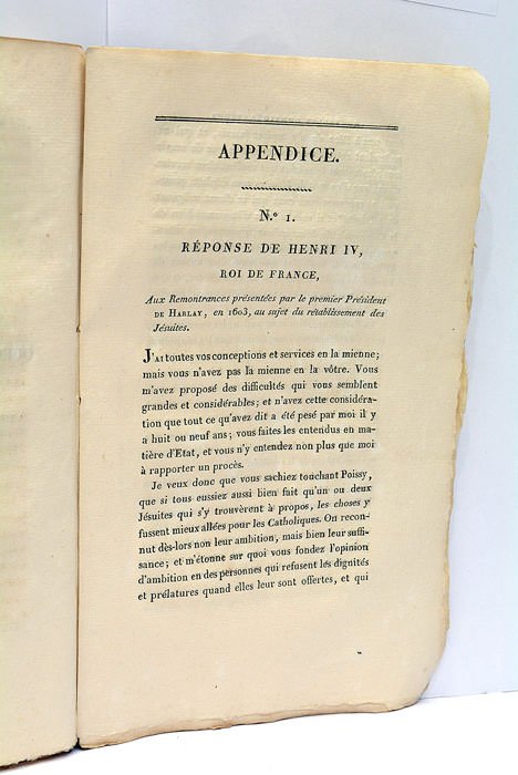 2 feuillets. 283 pages. (20 x 13 Cm). Broché, couverture muette de l’époque. Edition imprimée à Versailles. L’auteur tentait dans cet écrit d’examiner la question de l’Ordre des Jésuites avec impartialité, n’étant lui-même ni jésuite, ni un de leurs anciens élèves. Ancien évêque de Strasbourg, il démissiona de cette fonction lorsqu’il fut nommé précepteur du duc de Bordeaux. Dos fendillé, petits manques de papier. Bon exemplaire, non rogné.