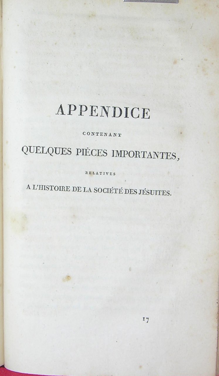 1817 A Versailles, J. A. Lebel, imprimeur du Roi, 1817. (2) ff., 284 pages. Reliure en demi-basane, dos lisse, titre, in fine Appendice contenant quelques pièces importantes, relatives A l'histoire de la société des jésuites.