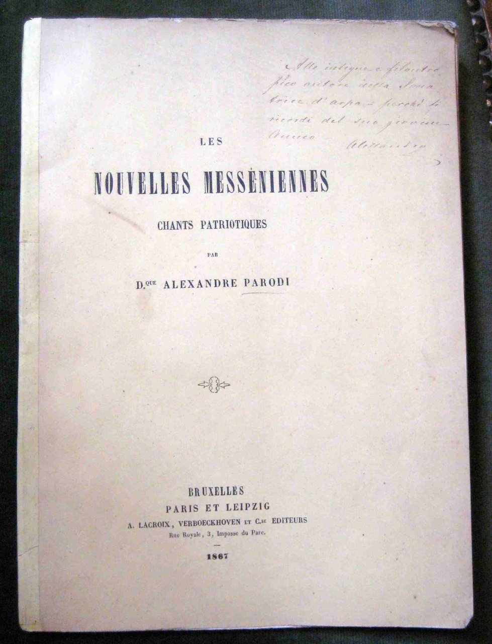 In 8°, pp. 46, (1). Brossura editoriale a stampa gialla (dorso con rinforzo dello stesso colore). Dedica autografa dell'autore al drammaturgo genovese David Chiossone ('. autore della Sonatrice d'arpa').