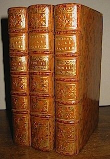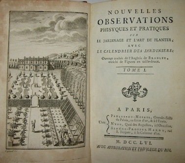 12mo (cm. 16,8), 3 Voll., antiporta fig., XXXVI-358 pp., 1 cc.nn., 4 tavv. f.t. più volte rip.; XV-510 pp, 1 c.nn. (bianca), 2 tavv. f.t.; 1 c.nn., 442 pp., 6 tavv. più volte rip. Ottime legature coeve in piena pelle con nervi, ricchi fregi e titolo oro al ds. Carte di guardia marmorizzate, tagli rossi. Minima abrasione al tassello del primo vol., ma esemplare in eccellente stato di conservazione. Prima ed unica edizione della traduzione francese dei lavori di botanica e orticoltura di Richard Bradley (1688-1732). I primi due volumi descrivono le proprietà di particolari piante (fiori, vegetali, frutti, ecc.), la loro coltivazione e la loro collocazione nei giardini. Il terzo volume contiene la traduzione del ‘Gentleman and gardeners calendar’, vero e proprio prontuario delle operazioni necessarie per il mantenimento dei giardini. Interessanti inoltre le osservazioni, sempre nell’ultimo volume, sulla pianta del caffè. Pritzel, 1076.