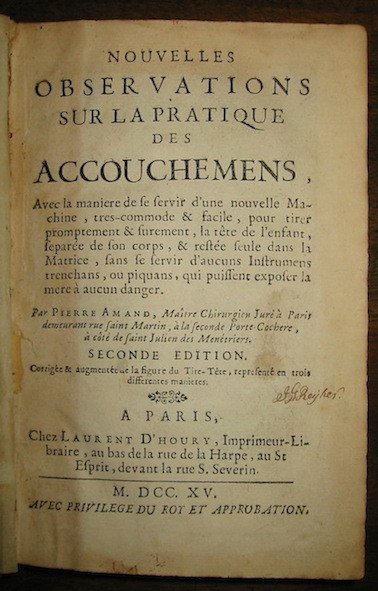 Nouvelles observations sur la pratique des accouchemens, avec la maniere de se servir d’une nouvelle Machine, tres-commode & facile, pour tirer promptement & surement, la tete de l’enfant. Seconde edition corrigée et augmentée de la figure du Tire-Tete, representé en trois differentes manieres
