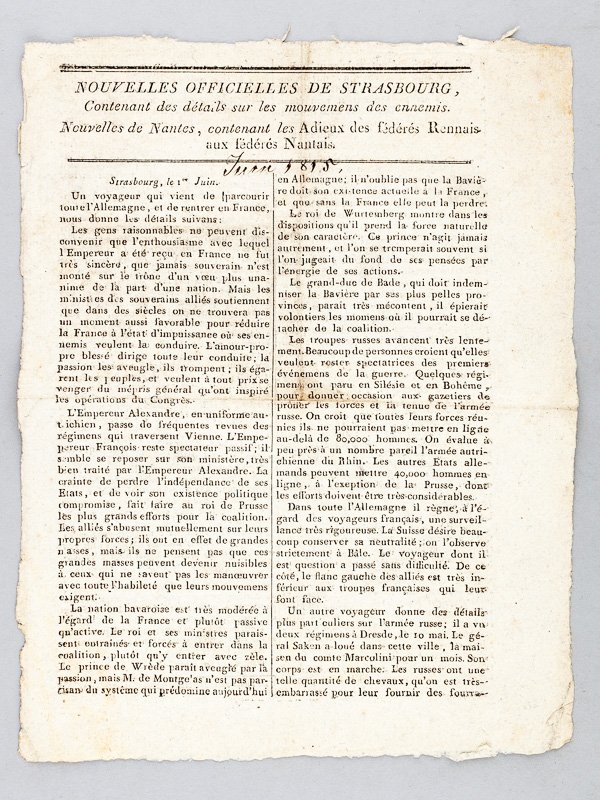 1 feuillet grand in-8, de l'Imprimerie de Fernel, rue Ste-Catherine, n° 83 La première partie du texte expose notamment les mouvements et les sentiments des troupes russes, autrichiennes ou bavaroises. On expose dans une seconde partie les "Adieux des confédérés Rennais à leurs amis les Nantais". Le 29 mai, 300 fédérés rennais étaient en effet venu prêter main-forte aux nantais face aux opérations hardies menées par les anciens chefs vendéens durant les troubles des Cent-Jours. Etat très satisfaisant