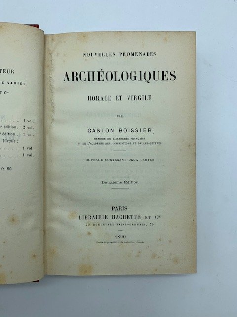 In 16, cm. 12 x 18, pp. 376 + (6), con due carte piu' volte ripiegate. Legatura in tela rossa con titoli in oro al dorso. Pagine leggeremente ingiallite dal fattore tempo con sporadiche bruniture. In buone condizioni. Testo in lingua francese.