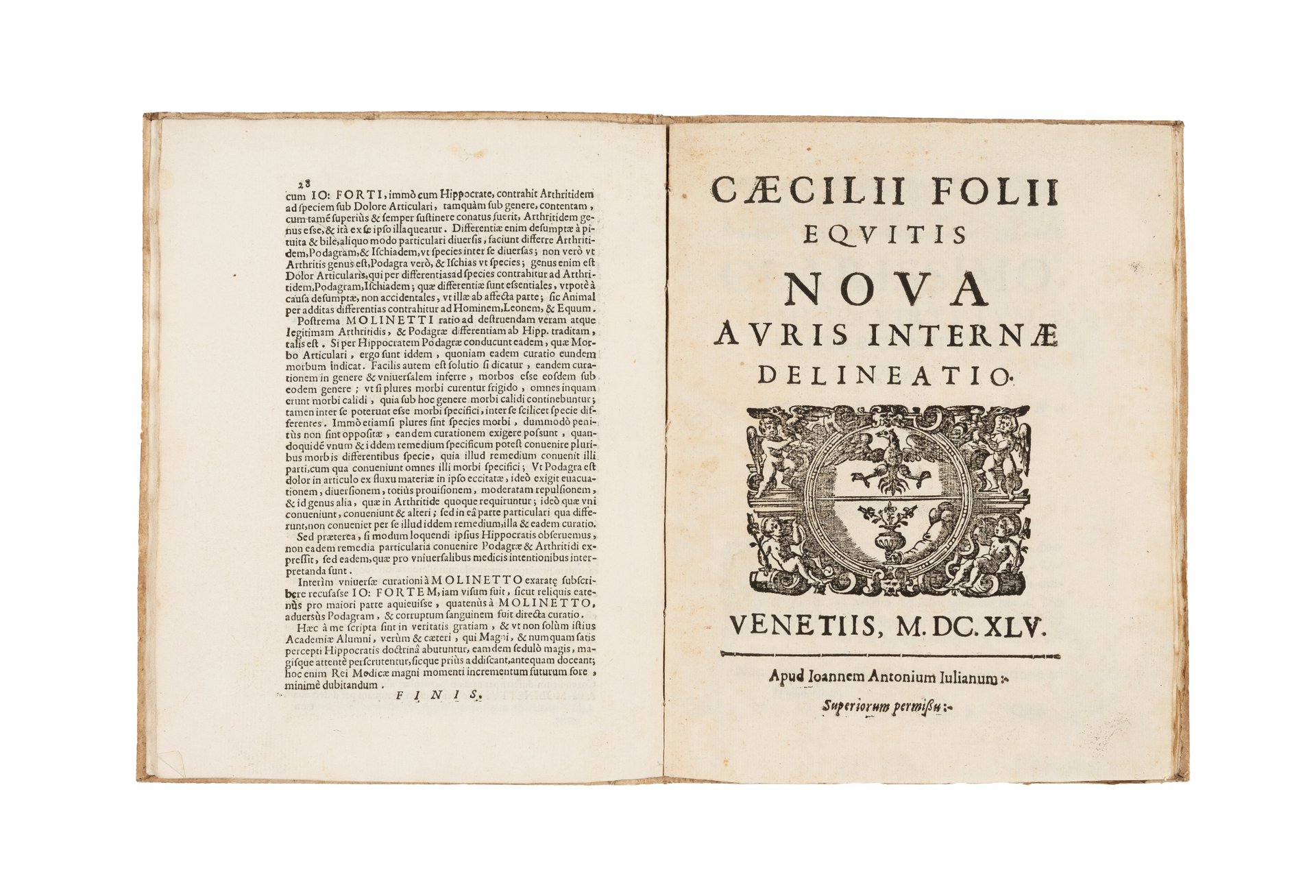 The work, sent as a letter - the dedication is dated Venice, May 10, 1645 - to the a Danish physician, mathematician, and theologian Thomas Bartholin (1616-1680), became immediately sought-after and rare. Its fame and importance are due to the engraved plate containing six figures that offer an extremely accurate and analytical description of the middle and inner ear. Folli describes some structures of the hearing organ never previously observed and, among the many remarkable morphological details showed in the plate and described in the pamphlet, of particular importance is the depiction in figure 2 (Figura Secunda) of the long process of the malleus, also called “Folli or Follian process”, that is a slender spur running anteriorly from the neck of the malleus toward the membrane of the tympanum. Folli also identifies the lenticular process of the anvil which he calls “os globulus”, whose discovery is attributed to S. de Le Boë. However, Folli mistakenly considers it as an independent bone. Figure 3 (Figura Tertia) gives “the first illustration of the so-called fourth ossicle (stapedis, osseus globulus); it appears to be an extension of the head of the stapes to which it is attached” (C.D. O'Malley & Edwin Clarke, The discovery of the auditory ossicles, in: “Bulletin of the history of medicine”, September-October 1961, vol. 35, no. 5, p. 441 and fig. 5).