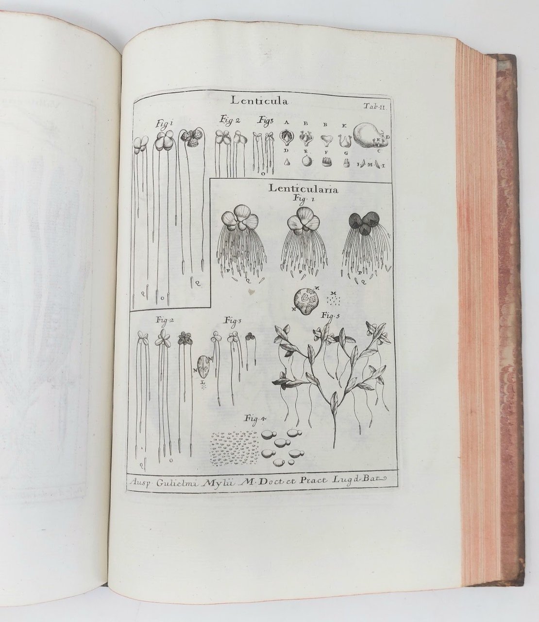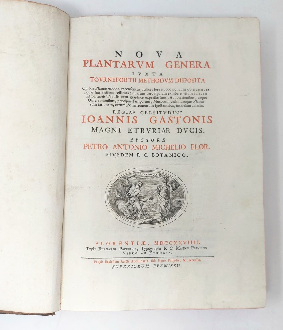 >in-folio (300x200 mm), pp. (24), 234, ottima legatura del tempo in pelle screziata, dorso a nervi con titolo e ricchi fregi oro, piatti con bordura in oro, tagli rossi (cerniere con qualche difetto, perdita d'oro ai piatti). Dedica dell'autore a Giangastone, Granduca di Toscana. Front. a stampa rossa e nera con vignetta inc., 2 grandi iniziali istoriate, 2 finaletti ed una testatina inc. Con 550 figure su 108 splendide tavole f.t. finemente inc. in rame, raffig. nell'insieme e nei particolari per lo più licheni, muschi e funghi. Prima edizione di questa importantissima opera contenente la descrizione di 1900 specie di piante, di cui 1400 prima sconosciute, fra cui molti funghi. L'autore, botanico fiorentino (1679-1737), con quest'opera fece conoscere per primo la vera struttura delle graminacee e gli organi riproduttori (spore e conidi) dei funghi, divenendo il padre della nuova disciplina, la micologia. L'opera fu molto lodata ed apprezzata dal Linneo, il quale dedicò al Micheli il genere «Michelia» (famiglia delle Magnoliacee). Magnifico esemplare, ex-libris di John Constable R.D. al contropiatto anteriore e timbro di L.H. Pennigton all'occhietto). Pritzel 6202. Nissen 1363. Brunet III,1707: «ce livre se trouve difficilement...».Reed 266: «A clean copy of the first edition of this work, which may be taken as a definitive starting point in the developmrnt of Mycology». Caldesi 128.