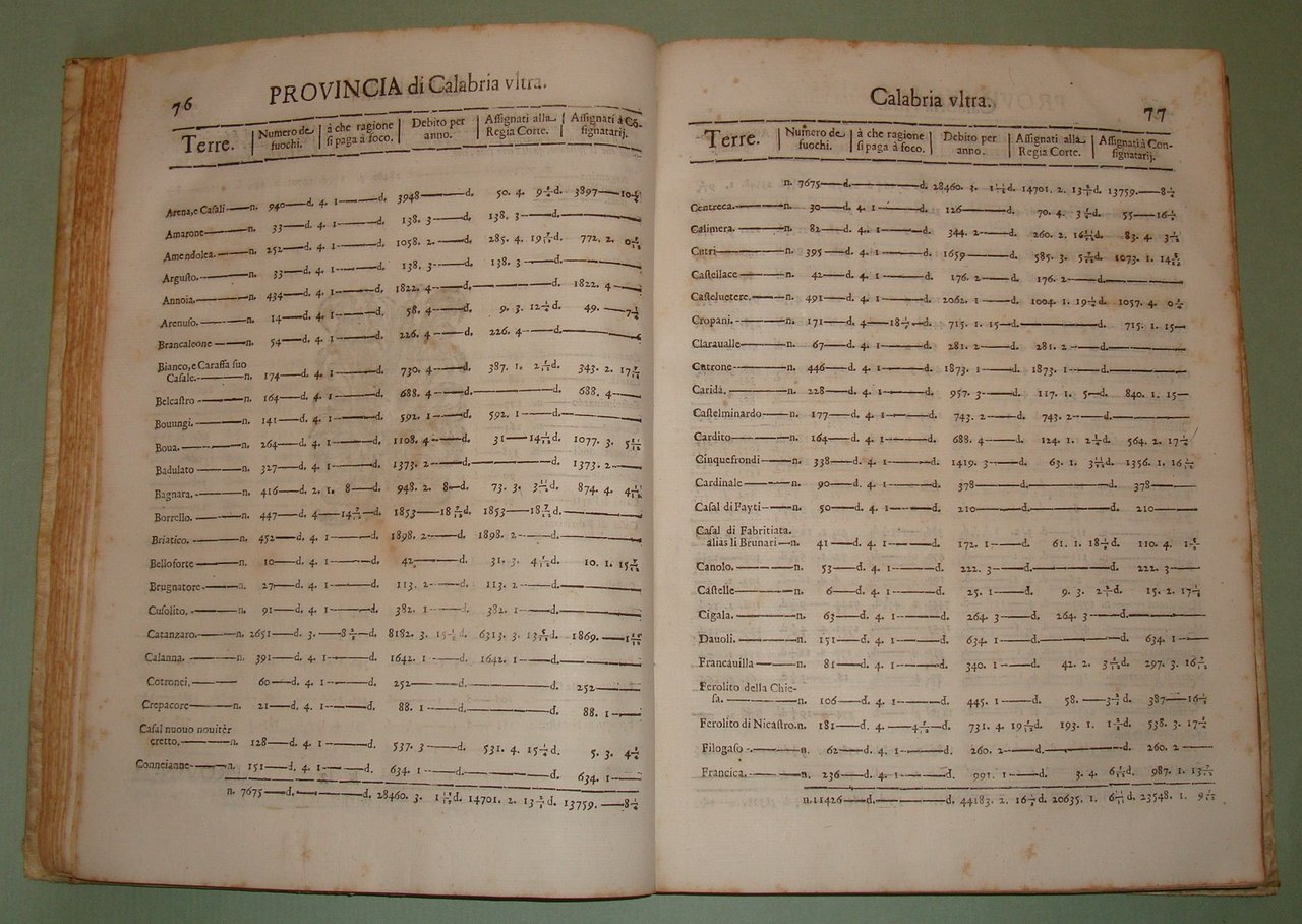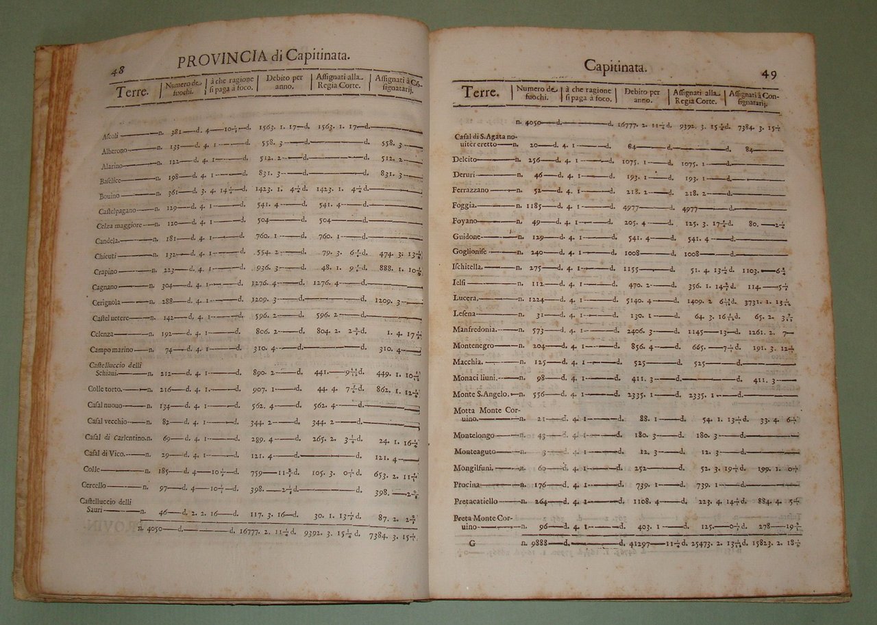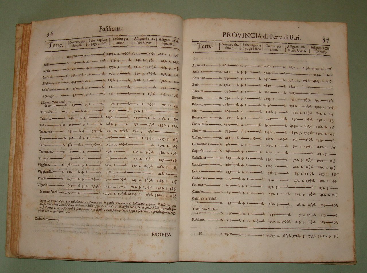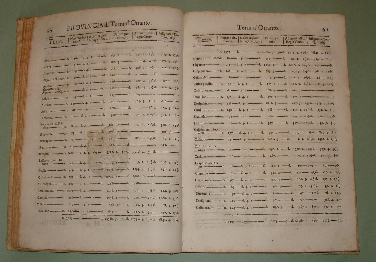 In Napoli, nella Regia Stamperia di Egidio Longo, 1670. In 4to; 2cc.n.nn., pp.467, 1n.n. Stemma di Pietro Antonio de Aragona al frontespizio, capilettera silografati. Pergamena coeva, titolo calligrafato al dorso. La numerazione dei fuochi serviva per identificare le varie famiglie del tempo. Era descritto il capofuoco, l'età, lo stato civile, l'attività lavorativa dei vari componenti del fuoco, l'elenco delle proprietà, e il tipo di dote che avevano le donne sposate. Per ogni fuoco era stabilita una tassa e il numero dei fuochi determinava la tassa complessiva che l'Università, l'attuale Comune, riscuoteva e pagava alle finanze del Regno. Il primo ad ordinare che fosse eseguita la numerazione dei fuochi fu Alfonso I d'Aragona nel 1443 e inizialmente fu effettuata con periodicità triennale per poi divenire quindicennale dal 1507 in considerazione delle spese notevoli che comportava; nel Seicento se ne ebbero una nel 1648 e una nel 1669. Sono riportate tutte le terre, le province, i feudi e i loro proprietari, le diocesi, le arcidiocesi. Terra di Lavoro, Principato Citra e Ultra, Capitanata, Basilicata, Terra di Bari, Terra d'Otranto, Calabria, Abruzzo, Contado di Molise. Idamaria Fusco, Il Regno di Napoli nella seconda metà del Seicento: il dibattito sulla numerazione dei fuochi: "Nel Regno di Napoli di Età moderna la numerazione dei fuochi rappresenta la principale fonte in grado di fornire una visione complessiva della realtà demografica meridionale, pur presentando numerosi limiti legati alla sua natura di fonte fiscale. In particolare, lo scoppio di una gravissima epidemia di peste tra il 1656 e il 1658 metterà in crisi l'intero sistema fiscale, basato su una numerazione, quella del 1648, già ampiamente criticata dagli stessi contemporanei. Da qui l'ampio dibattito, finora poco noto, che porterà all'adozione di vari rimedi provvisori e alla pubblicazione finale della successiva numerazione del 1669."