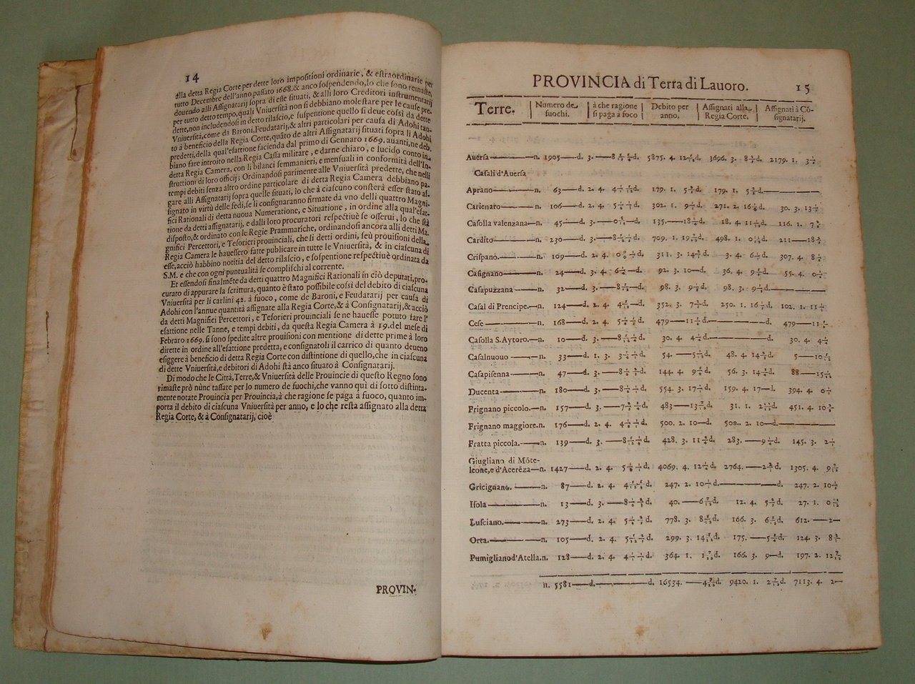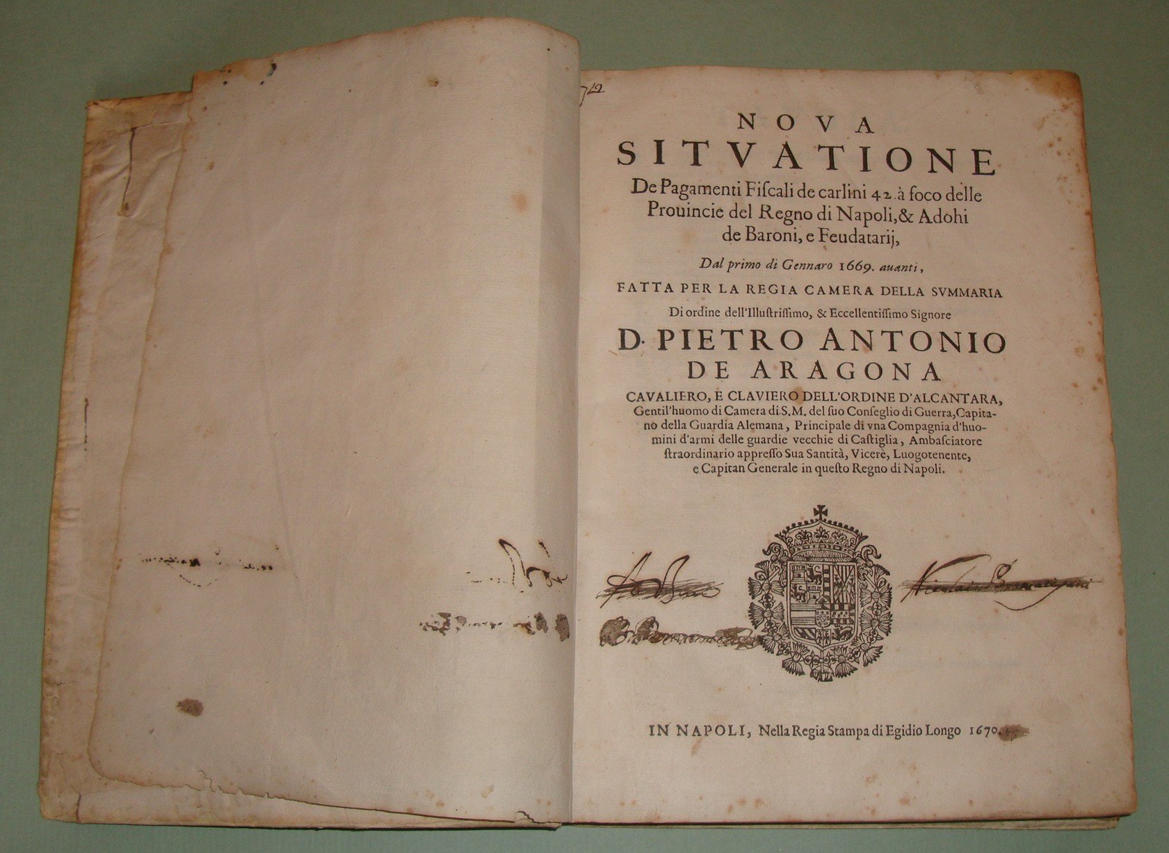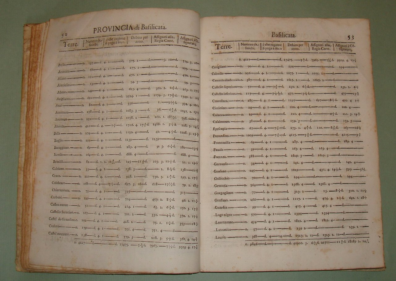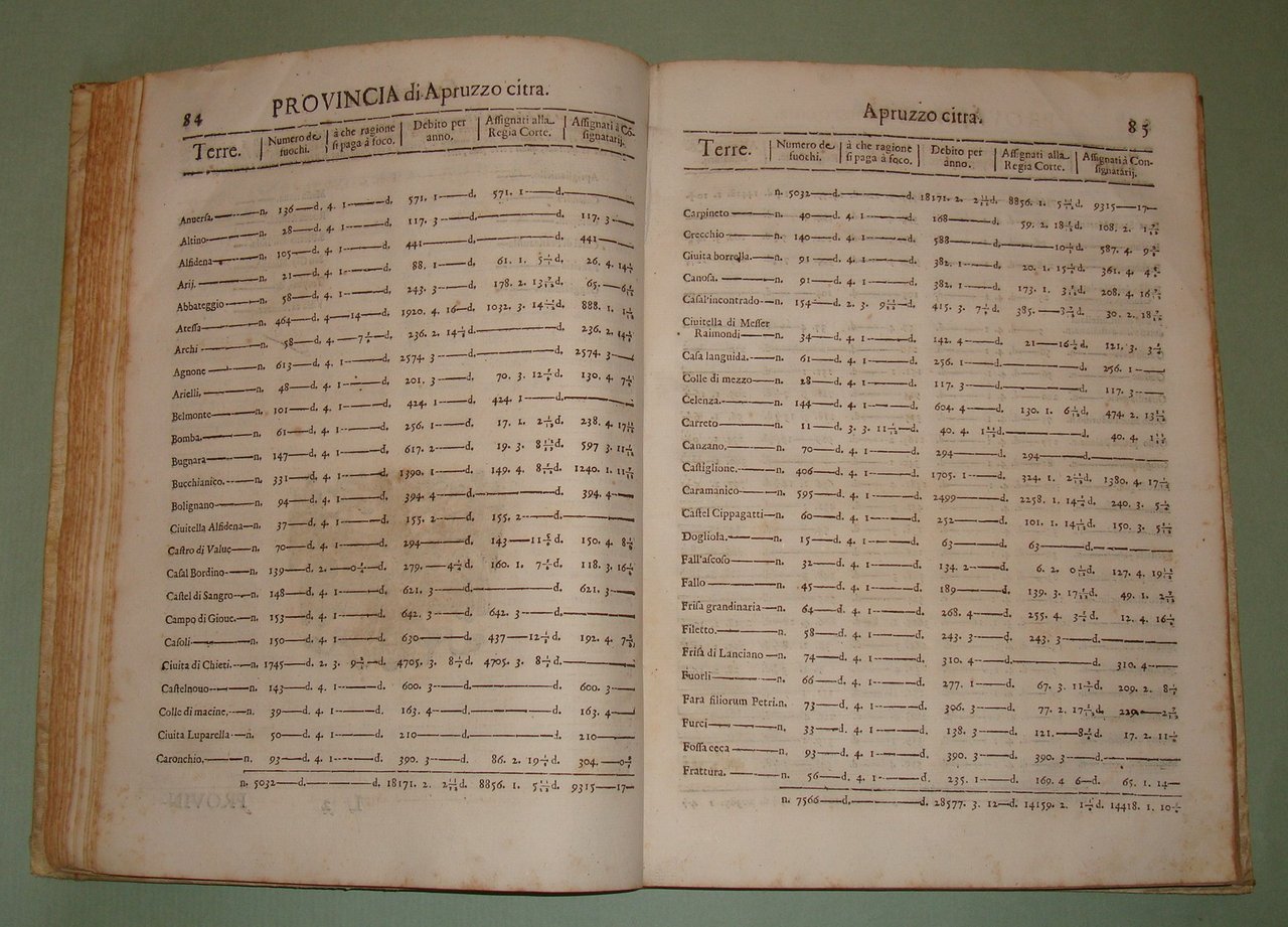 In Napoli, nella Regia Stamperia di Egidio Longo, 1670. In 4to; 2cc.n.nn., pp.467, 1n.n. Stemma di Pietro Antonio de Aragona al frontespizio, capilettera silografati. Pergamena coeva, titolo calligrafato al dorso. La numerazione dei fuochi serviva per identificare le varie famiglie del tempo. Era descritto il capofuoco, l'età, lo stato civile, l'attività lavorativa dei vari componenti del fuoco, l'elenco delle proprietà, e il tipo di dote che avevano le donne sposate. Per ogni fuoco era stabilita una tassa e il numero dei fuochi determinava la tassa complessiva che l'Università, l'attuale Comune, riscuoteva e pagava alle finanze del Regno. Il primo ad ordinare che fosse eseguita la numerazione dei fuochi fu Alfonso I d'Aragona nel 1443 e inizialmente fu effettuata con periodicità triennale per poi divenire quindicennale dal 1507 in considerazione delle spese notevoli che comportava; nel Seicento se ne ebbero una nel 1648 e una nel 1669. Sono riportate tutte le terre, le province, i feudi e i loro proprietari, le diocesi, le arcidiocesi. Terra di Lavoro, Principato Citra e Ultra, Capitanata, Basilicata, Terra di Bari, Terra d'Otranto, Calabria, Abruzzo, Contado di Molise. Idamaria Fusco, Il Regno di Napoli nella seconda metà del Seicento: il dibattito sulla numerazione dei fuochi: "Nel Regno di Napoli di Età moderna la numerazione dei fuochi rappresenta la principale fonte in grado di fornire una visione complessiva della realtà demografica meridionale, pur presentando numerosi limiti legati alla sua natura di fonte fiscale. In particolare, lo scoppio di una gravissima epidemia di peste tra il 1656 e il 1658 metterà in crisi l'intero sistema fiscale, basato su una numerazione, quella del 1648, già ampiamente criticata dagli stessi contemporanei. Da qui l'ampio dibattito, finora poco noto, che porterà all'adozione di vari rimedi provvisori e alla pubblicazione finale della successiva numerazione del 1669."