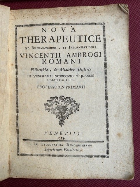 Nova therapeutice ad rheumatismum, et inflammationes Vincentii Ambrogi Romani philosophiae, & medicine doctoris in venerabili nosocomio S. Joannis Calybitae urbis professoris primarii.