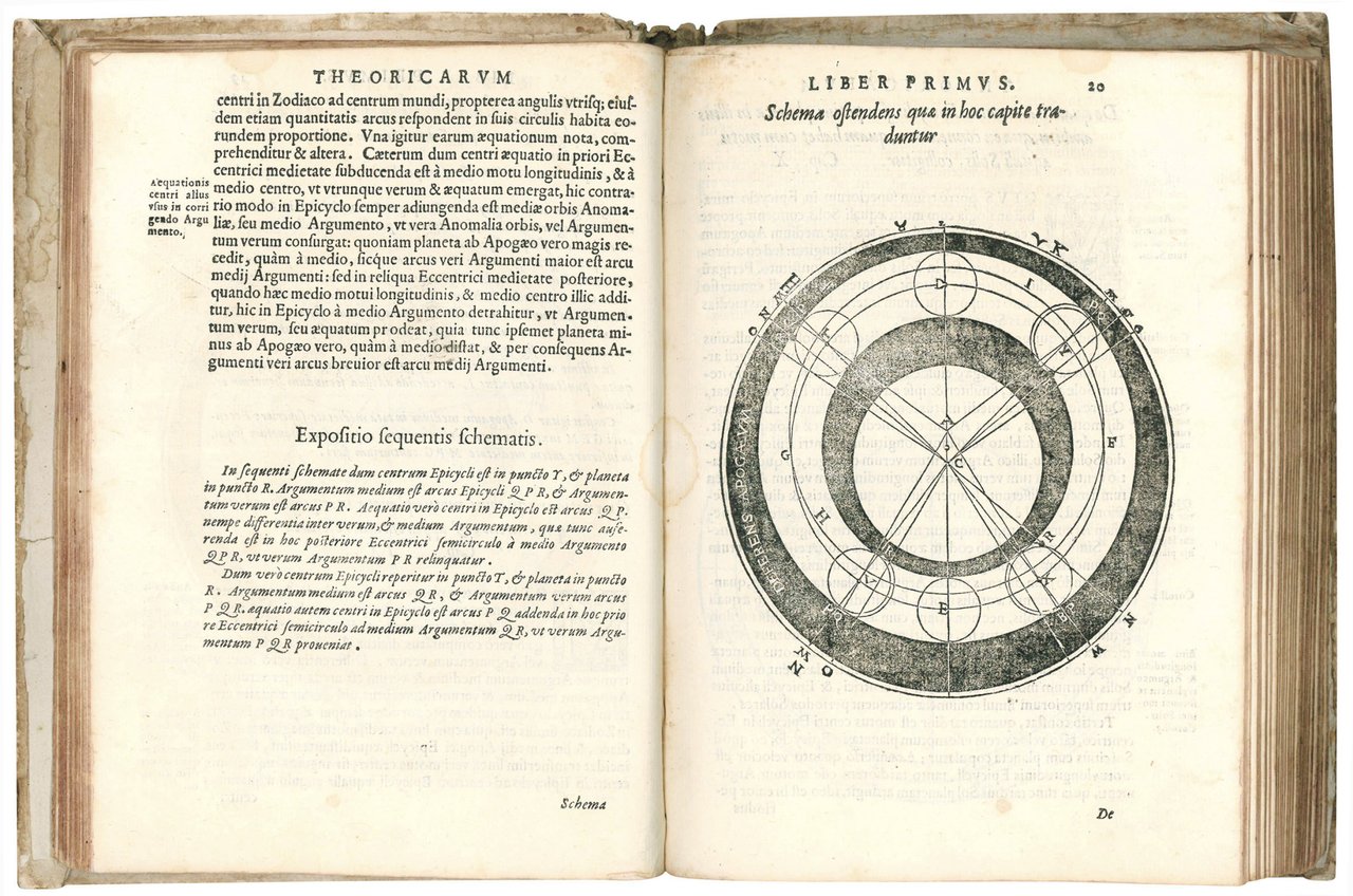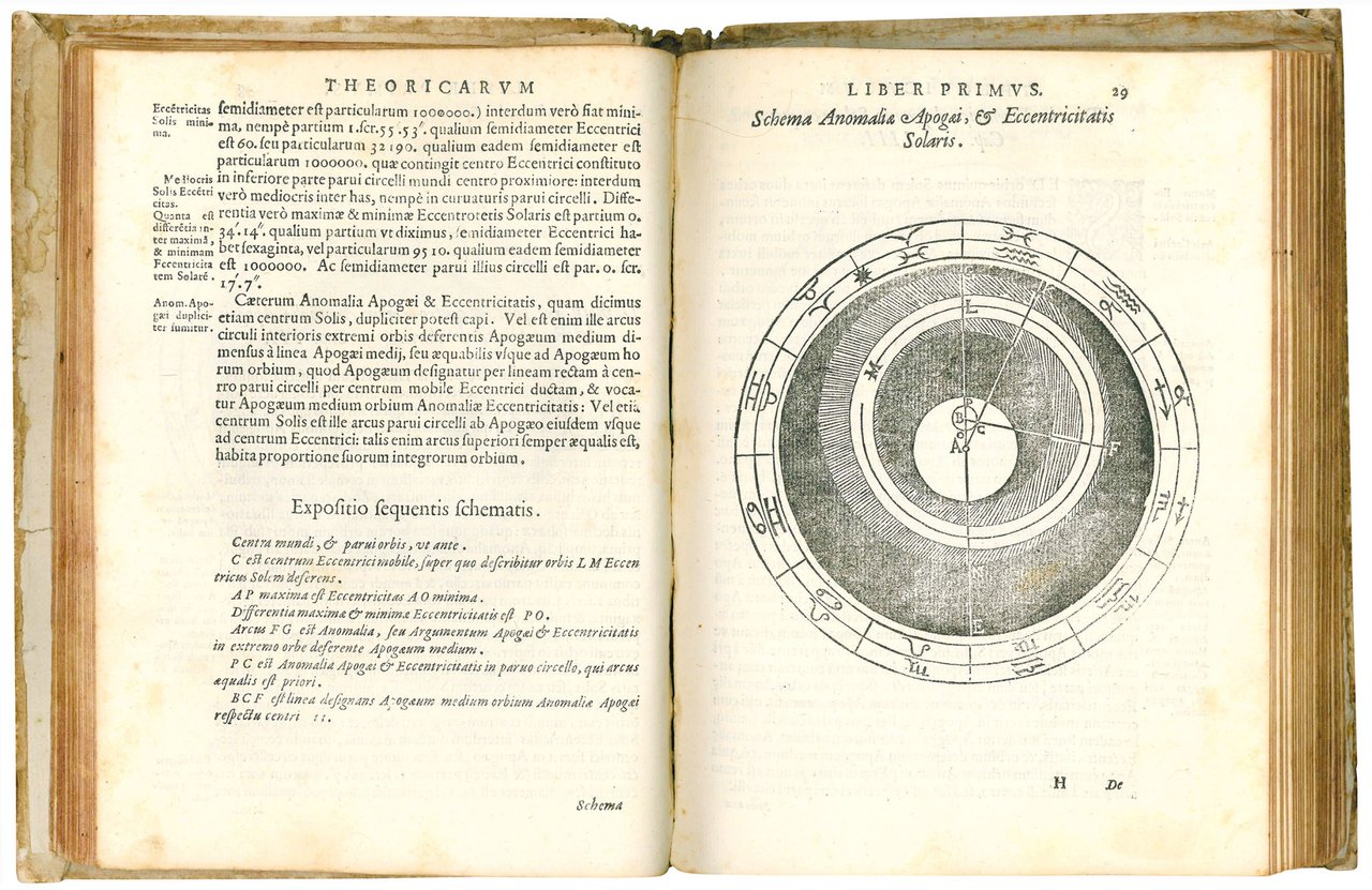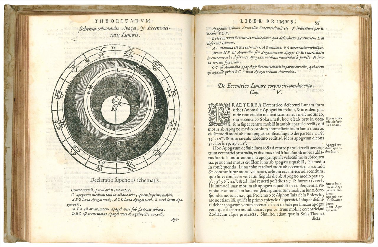 4to (228x173 mm). [14], 115 leaves. Collation: a-b4 c6 A-Ff4. Lacking the final blank. Engraved title page bearing at the bottom the printer's device. With several diagrams and woodcut illustrations of planetary orbits in the text. Roman and italic type. Woodcut historiared initials and decorative headpieces. Later boards (worn and soiled). Title page reinforced at gutter, small holes to title page and following leaf slightly affecting the engraving, worm track to the final three leaves with loss of text in the printed marginalia, some foxing and browning.