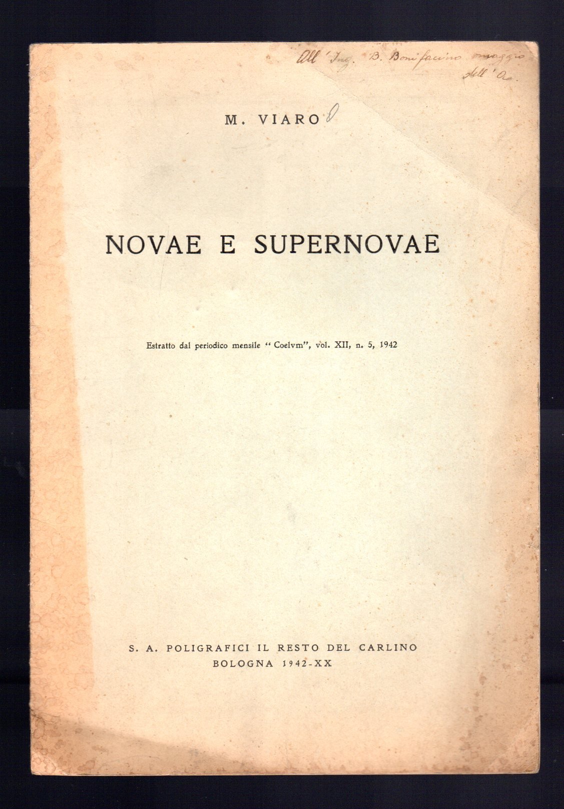 Opuscolo vintage. Estratto dal periodico mensile "Coelvm", vol. XII, n. 5, 1942. Dedica autografa dell'autore. Segni di matita in copertina. Piega in quarta. Ordinario segno del tempo.