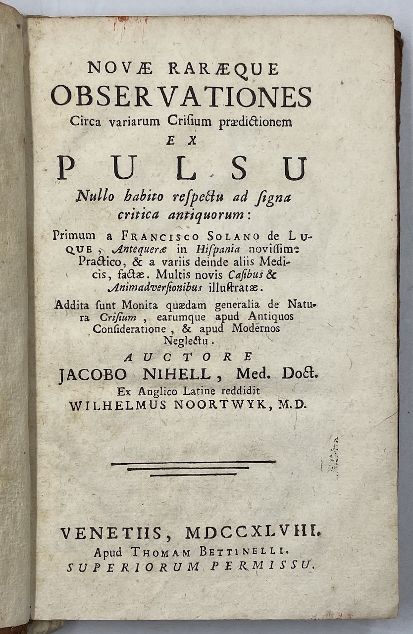 NOVÆ RARÆQUE OBSERVATIONES Circa variarium Crisium prædictionem EX PULSU Nullo habito respecto ad signa critica antiquorum: Primum a FRANCISCO SOLANO de LUQUE, Antequeræ in Hispania novissime Practico, & a varios deinde alias Medicis, factæ. Multis novis Casibus & Animadversionibus illustratæ. Addita sunt Monita quædam generalia de Natura Crisium, eaurmque apud Antiquos Consideratione, & apud Modernos Neglectu. AUCTORE JACOBO NIHELL, Med. Doct. Ex Anglico Latine redditi WILHELMUS NOORTWYK, M. D. VENETIIS, MDCCXLVIII. Apud Thomas Bettinelli. [1748]