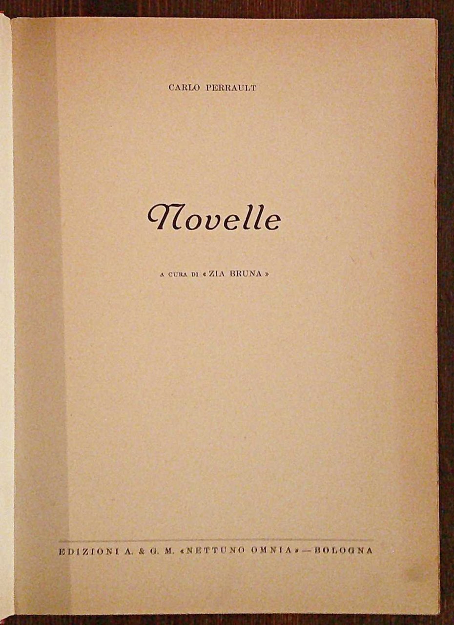 Novelle di Perrault (a cura di "Zia Bruna"). 4 Tavole a colori f.t. Ed. Nettuno Omnia - Bologna, 1953. Cartonato editoriale con dedica di vecchia appartenenza in antiporta. 17,5x24,5; pp.154. Ottimo stato. , Ottimo (Fine)