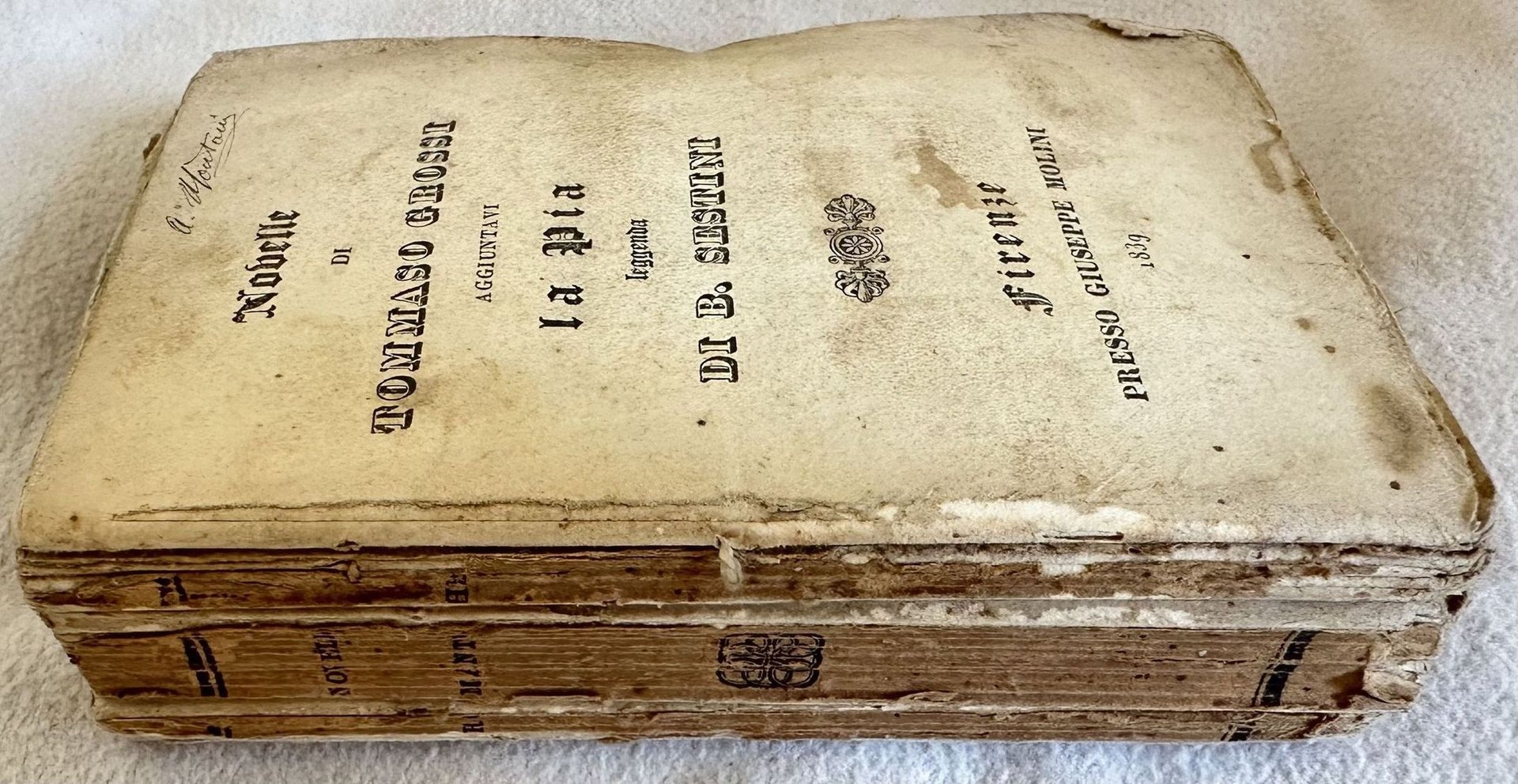 Edizione del 1839 di questa raccolta di novelle dello scrittore e poeta milanese Tommaso Grossi (1790-1835). In fine "La Pia" leggenda romantica del poeta e carbonaro di origine pistoiese Benedetto Sestini (1816-1890). All'interno una tavola staccata dalla legatura. In discrete condizioni. Copertina editoriale in discrete condizioni generali con lievi usure e strappi ai margini e dorso. Piatto anteriore assente. Legatura in mediocri condizioni con rotture. Pagine in buone condizioni con fioriture. La tavola presenta usure e mancanze. In 24. Dim. 12,5x8,5 cm. Pp. 358. Edition of 1839 of this collection of short novels by the writer and poet from Milan Tommaso Grossi (1790-1835). At the end "La Pia" romantic legend by the poet and carbonaro from Pistoia Benedetto Sestini (1816-1890). Inside a plate detached from binding. In fair conditions. Editorial cover in fair conditions lightly worn with tears in the edges and spine. Front plate is detached. Binding in poor conditions with cracks. Pages in good conditions with foxing. The plate has lacks and usage signs. In 24. Dim. 12,5x8,5 cm. Pp. 358.