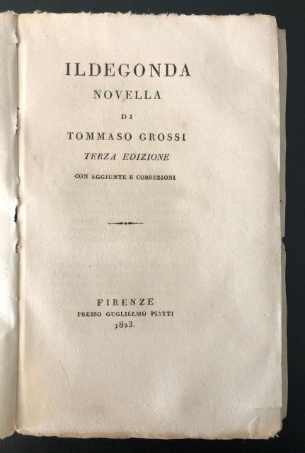 Terza edizione con aggiunte e Correzioni. Guglielmo Piatti, Firenze, 1823. In 12esimo (cm 10 x 16), pp. 108. Tommaso Grossi (Bellano, 1790 – Milano, 1853) è stato uno scrittore e poeta esponente del romanticismo lombardo, convinto romantico e amico del Porta e del Manzoni. Privo di brossura, buono stato di conservazione.