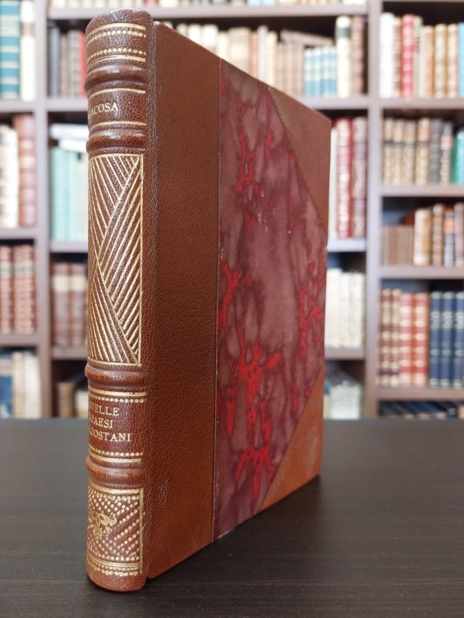 In-16° (cm. 18,1), elegante legatura d'amatore in mezza pelle ad angoli, dorso a nervi con titolo, filetti in composizioni geometriche e fregi in oro, taglio superiore rosso, taglio laterale e inferiore cesellati; pp. [8] 356 in stato molto buono (lievi e sporadiche fioriture); Ex libris a contropiatto e risguardo. Vignetta incisa al frontespizio. Dedica a stampa dell'autore a Giovanni Camerana. Prima edizione. Esemplare molto buono. (NH9)