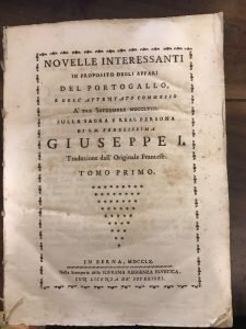 NOVELLE INTERESSANTI IN PROPOSITO DEGLI AFFARI DEL PORTOGALLO, E DELL’ATTENTATO COMMESSO A TRE SETTEMBRE MDCCLVIII SULLA SAGRA E REAL PERSONA DI S.M. FEDELISSIMA GIUSEPPE I. TOMO PRIMO