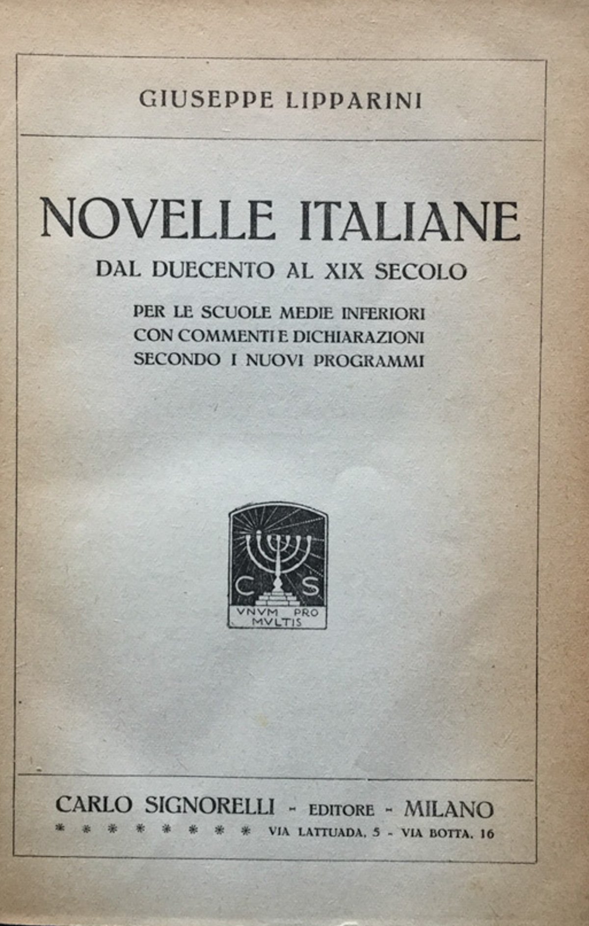 Giuseppe Lipparini, Novelle italiane dal Duecento al XIX secolo per le scuole medie inferiori con commenti e dichiarazioni secondo i nuovi programmi. Milano, Signorelli, 1927. Cartonato mezza tela- 360 pp., 20 cm. Condizioni buone, copertina parzialmente disarticolata 12 Buono (Good) Buono