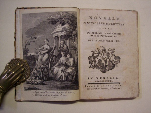In 16° (cm. 17 x 12); pp. VIII, 224; legatura d'epoca in cartonato marmorizzato con dorso in pelle con tassello e fregi oro; graziosa antiporta incisa in rame su invenzione di P. A. Novelli.<BR>Condizioni nel complesso buone: abrasioni ai piatti, in particolare ai margini; alcune fioriture; traccia di bruciato di cm. 1 di diametro passante fra le pagine 89 - 95 che fora p. 89 (ma il testo resta comprensibile) e macchia, in decrescendo, le altre; strappo, senza perdita, di cm. 6 che sfiora il testo al margine di p. 197.