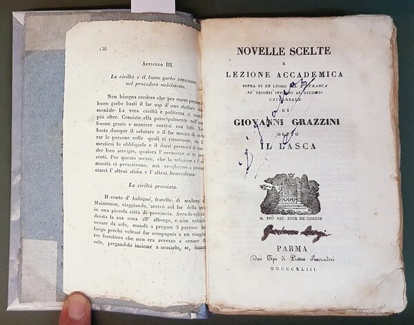 Vol. in -16 (11 x 16,5 cm.), legatura cartoncino moderno col. blu con velina trasparente di protezione, brossura editoriale originale preservata all'interno, pp. 256 (erroneamente scritto 356). Firma di antica proprietà sul frontespizio, tagli dei fogli leggermente ammaccati, nel complesso in più che discrete condizioni (integro e ben legato).