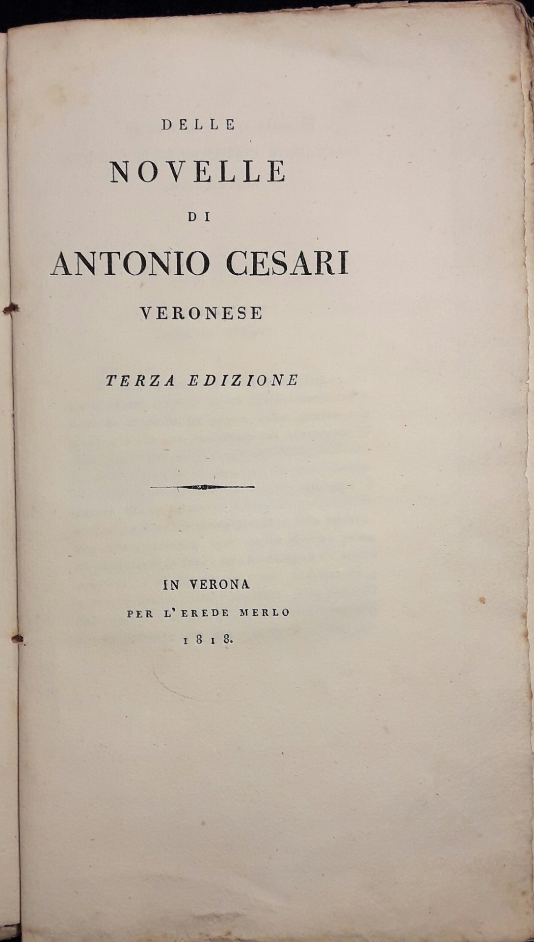 Terza edizione. In 8°, p.VI,229(3). Contiene novelle dedicate a Giulio Bernardino Tomitano di Oderzo e il dramma giocoso per musica Il Macco. Ottimo esemplare in carta pesante, con barbe. Cartoncino muto.
