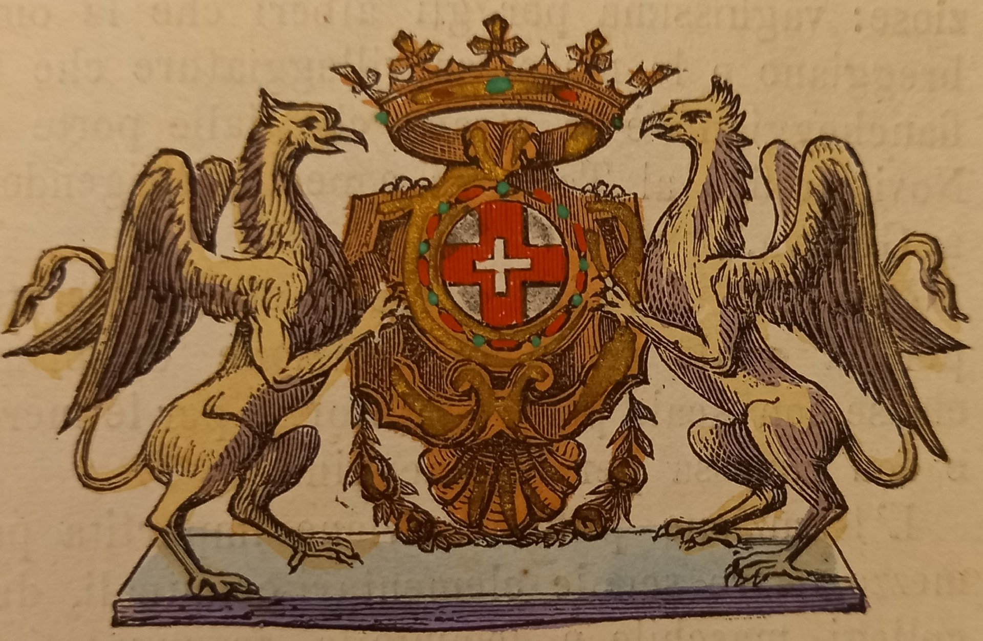 Piccolo stemma comunale colorato a mano d’epoca (cm. 3,8 x 3,2 ca.). Stralcio dal Dizionario Corografico illustrato dell’Italia, edito a Milano nel 1868. Ogni stemma di questa raccolta è inserito in una o più pagine di testo con la descrizione della località, notizie storico - geografiche e statistiche (numero degli abitanti e degli elettori, guarnigioni della Guardia Nazionale, ecc.). Spesso il testo è redatto da studiosi locali o dai sindaci, con maggiori, interessanti notizie.