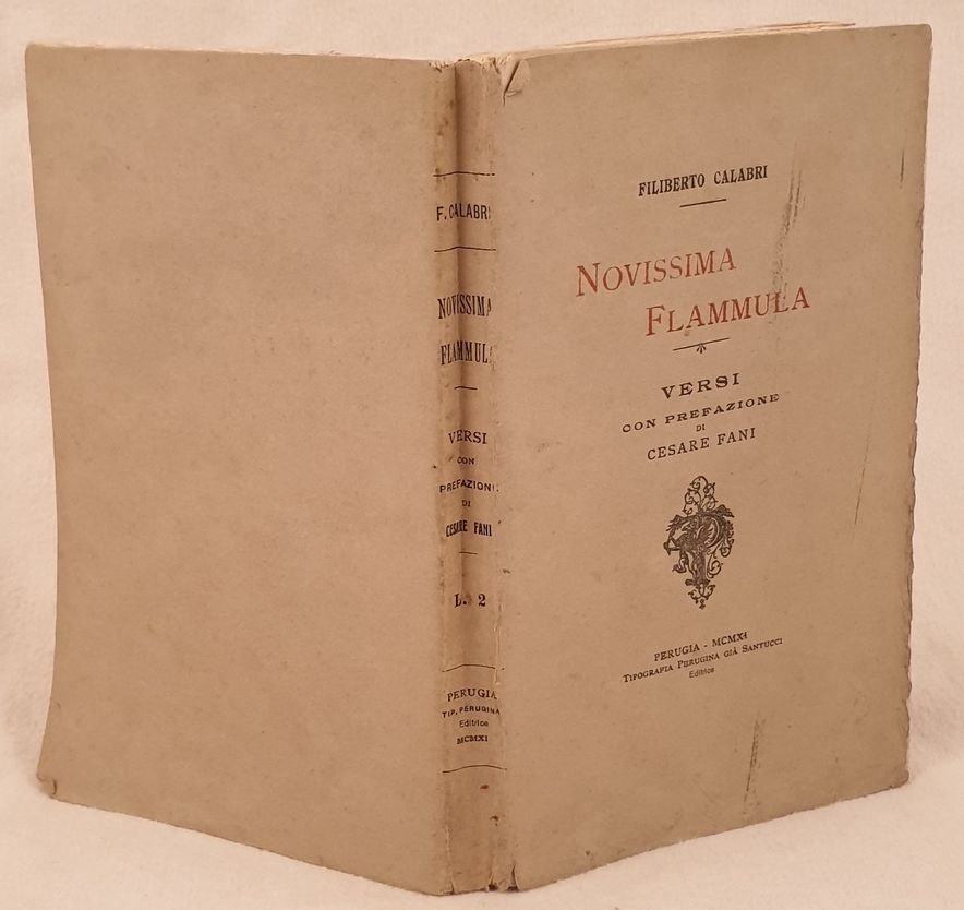 Edizione del 1911 di questi versi scritti da Filiberto Calabri. Prefazione del politico nativo di Perugia Cesare Fani (1844-1914). In buone condizioni. Copertina editoriale in buone condizioni generali con lievi usure ai margini e dorso. Legatura in diiscrete condizioni con qualche lieve rottura. All'interno le pagine si presentano in ottime condizioni con rare fioriture. In 8. Dim. 17,5x11 cm. Pp. XXIII+(1)+183+(1). Edition of 1911 of these poems written by Filiberto Calabri. Prefation by the politician from Perugia Cesare Fani (1844-1914). In good conditions. Editorial cover in good general conditions slightly worn in the edges and spine. Binding in fair conditions with some crack. Pages in very good conditions with occasional foxings. In 8. Dim. 17,5x11 cm. Pp. XXIII+(1)+183+(1).