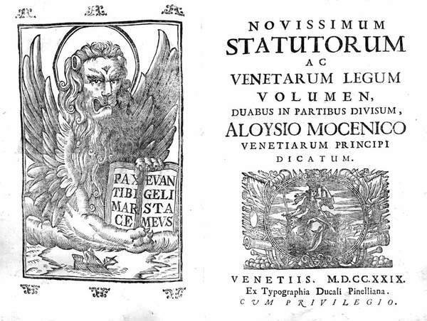In-8 p. (mm. 235 x 165), 2 parti in 1 vol., p. pelle coeva (picc. restauri), tagli rossi, 12 cc.nn., 345 cc.num.; 4 cc.nn. (la prima bianca), 86 cc.num.; (segue) "Pratica sommaria civile, et criminale di tutte le leggi del Statuto Veneto", 4 cc.nn., 128 pp.num.; con 2 due grandi inc. su legno a piena pag. nel testo (di cui 1 all'antiporta) che raffigurano il leone di S. Marco, e con una vignetta allegorica al frontesp., pure silografata, che raffigura la Giustizia. Testo in latino e in italiano. Raccolta di leggi civili e criminali dall'XI agli inizi del XVIII secolo.Cfr. Cicogna,1212: Comprende questo volume i primi cinque libri del doge Giacomo Tiepolo, e sesto del doge Andrea Dandolo; gli Statuti de' Giudici di Petizione formati l'anno 1244, le Leggi antiche sotto il titolo di "Consulta"; la legge Pisana fatta l'anno 1492; la Pratica del Palazzo di Venezia; le Correzioni de' Dogi Barbarigo, Loredan, Grimani, Gritti, Trevisan, Contarini.., con alcuni decreti fatti anteriormente nella vacanza del dogado di Francesco Venier e di Lorenzo Priuli; non che le leggi, ordini, decreti di diversi Consigli di Venezia nelle materie Civili posti per ordine di tempi.. - Fontana,III,295 - Lozzi,I,594 - Manzoni,I,p. 535: "Questa e' l'edizione piu' completa degli Statuti Veneti".Frontesp. restaur. per picc. manc. margin., con fiorit. interc. nel testo, ma certam. un buon esemplare.