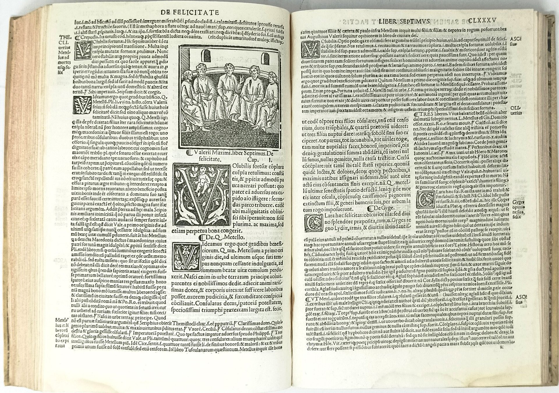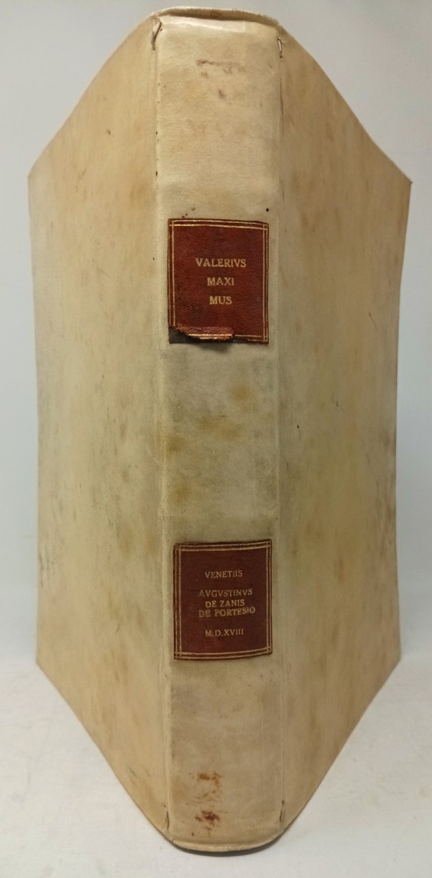 >in-folio (300x205 mm), ff. (10), CCLXXI, (1 f. bianco mancante); legatura settecentesca piena pergamena, duplice tassello in pelle al dorso. Titolo a stampa rossa e nera in caratteri gotici, grande impresa tipografica raffigurante S. Bartolomeo, 9 belle grandi figure xilografiche nel testo tratte dell'edizione di Bart. Zanni del 1508, eccetto quella del f. CLVI tratta dall'edizione di Ovidio del 1506, centinaia di iniziali istoriate o ornate su fondo nero di varie dimensioni. Pregevole edizione dei Factorum dictorumque memorabilium libri IX con il testo inquadrato dal commento di Bade Josse (1462-1535), Chalcondylas Theophilus (sec. XV-XVI) e Oliviero d'Arzignano (sec. XV). Si tratta di una raccolta di fatti e detti memorabili in nove libri. Discreto esemplare (piccoli aloni d'umido nei margini interni dei primi e ultimi fogli). Sander III, 7456. Essling I, 216. BM STC 708. Manca all'Adams e al Dibdin.