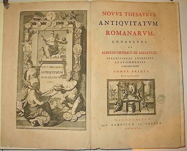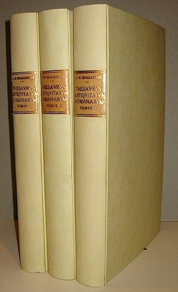 4to (cm 40,5), 3 Voll.: 8 cc.nn., da colonna 9 a 1328, 10 cc.nn., una testata incisa alla dedica, alcuni capilettera ornati e una tavola f.t. riferita alla colonna 519; 12 cc.nn., da colonna 17 a 1448, 13 cc.nn., ill.ni n.t. e 15 tavv. f.t. (mancanti due carte bianche finali); 14 cc.nn., da colonna 17 a 1252, 23 cc.nn., ill.ni n.t. e 2 tavv. f.t. rip. I tre volumi con antiporta figurata (compresa nelle prime carte nn.) e frontis. stampato in rosso e nero con una grande incisione. Ottima e solida legatura recente in carta pergamenata con titolo oro su tassello in pelle al ds. Segnalibro in seta. Timbretto di bibl. al frontis. (con scritta: duplicato), aloni e fioriture, ma nel complesso buon esemplare. Prima edizione. I tre Voll., che fanno seguito alle Antichità romane di Graevius, riuniscono 85 opere erudite che non si trovano facilmente in edizioni separate. Questa può essere considerata la migliore edizione: Olschki, 18021; Rossetti, 9049.