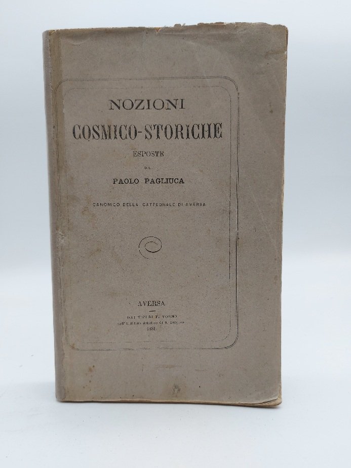 In 8 (cm 14,5 x 23,5), pp. 372 con 2 tavole finali ripiegate. Brossura editoriale con dorso rifatto. Edizione originale di questa poco comune compendio di cosmogonia del canonico della cattedrale di Aversa, Paolo Pagliuca, cultore delle discipline storiche e delle memoria patrie. Insegno' anche scienze naturali presso il Seminario cittadino.