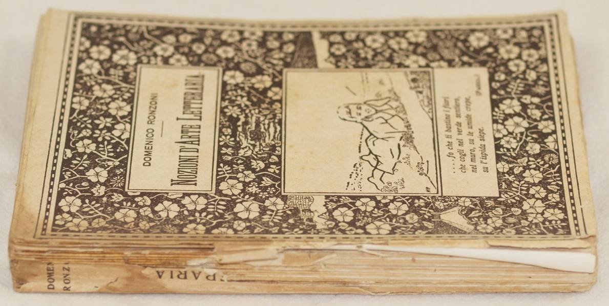 In 8. Dim. 19,5x13 cm. Pp. 411. Edizione del 1919 di questo volume di arte letteraria scritto da Domenico Ronzoni (1868-1933) sacerdote insegnante di materie letterarie.<BR>Volume ad uso dei ginnasi e degli istituti tecnici. All'interno: elementi dell'opera letteraria (lingua, prenozioni, purezza e proprietà della lingua, studio, periodo, proprietà e armonia del periodo, stile, disposizione), Versi e metri italiani, Generi e componimenti letterari, L'opera d'arte ecc. All'interno sono presenti alcune planches. In discrete condizioni. Bella brossura editoriale con poesia di Pascoli. Copertina editoriale in mediocri condizioni generali con usure e parti mancanti ai margini e dorso. Legatura quasi assente. All'interno le pagine si presentano in buone condizioni con rare fioriture. Edition of 1919 of this volume of litterary art written by Domenico Ronzoni (1868-1933) priet teacher of litterary matters. Volume for the usage of high school. Inside: elements of litterary work (language, prenotions, purity and property of language, study, period, property and harmony of style, disposition), Verses and italian meters, Litterary kinds and components, The art work ecc. Isndie there are some planches. In fair conditions. Beautiful editorial cover with poem by Pascoli. Editorial cover in poor general conditions with wearings and missing parts in the edges and spine. Binding is almost missing. Inside pages are in good conditions with occasional foxings.