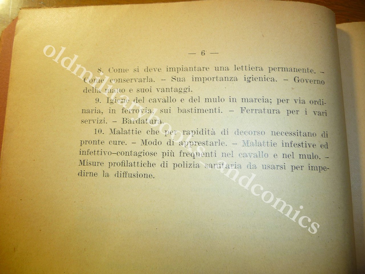Brevi note di anatomia e fisiologia, descrizione dei mantelli, razione e abbeverata, lettiera, igiene del mulo e del cavallo, anche in ferrovia e in nave. Come riconoscere l'età, pronto soccorso veterinario. Come riconoscere pregi e difetti del fieno e dell'avena.