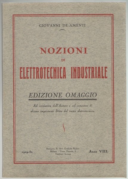 Nozioni di Elettrotecnica Industriale. Edizione Omaggio Ad iniziativa dell’Autore e col concorso di alcune importanti Ditte del ramo elettrotecnico.