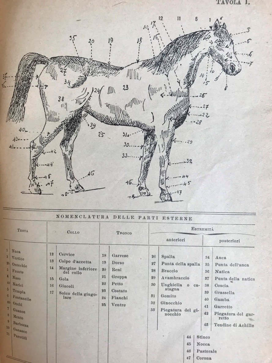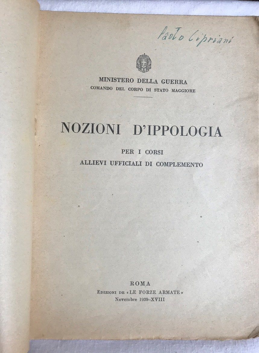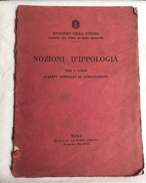 Fascicolo in 8 grande, brossura editoriale, titolo al piatto, sguardie, frontespizio, 81 pp. comprensive di appendice ed indice, bianca, occhiello, 3 tavole f.t. di illustrazioni, bianche finali. A cura del Comando del Corpo di Stato Maggiore del Ministero della Guerra questo utile opuscolo illustra innanzi tutto le caratteristiche fisiologiche del Cavallo e del Mulo, descrivendone anche razze, particolarit, mantelli e possibili tare; il mantenimento, l'igiene e la cura di questi animali viene minuziosamente spiegata, contiene pure le generalit sulla ferratura e chiare indicazioni sull'applicazione dei finimenti. In appendice troviamo i Mezzi per riconoscere l'et del Cavallo e del Mulo ed i diversi caratteri adeguabili alla sella o al tiro ed alla soma nel Mulo, nozioni atte a riconoscere il buon fieno e le sue possibili alterazioni, ed importanti nozioni di primo soccorso all'animale. A completamento di questo manuale l'illustrazione del Cavallo a figura intera, una tabella per la nomenclatura e quattro fasi di dentizione per il riconoscimento dell'et. Lievi mende e mancanze alla brossura. Pratico ed interessante trattatello, in buono stato.