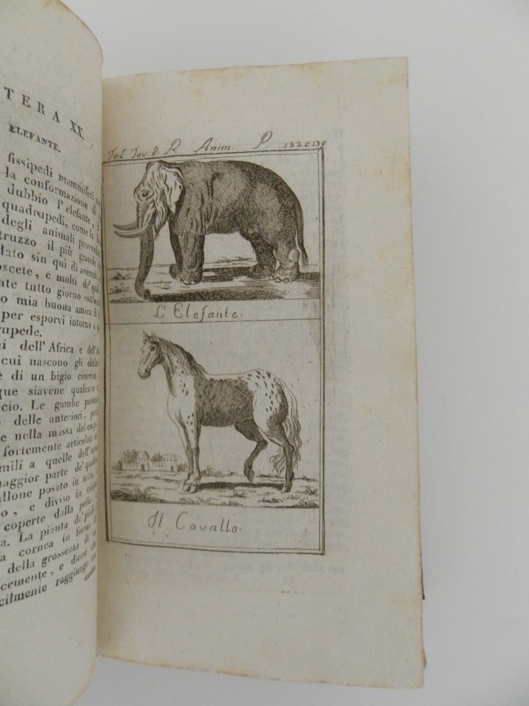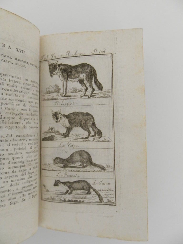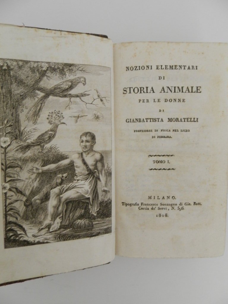 16°, mm 180x105, due parti in un volume di pp. VIII, 259, (1) e 314, (2), legatura in piena pelle coeva dorso a cinque nervi con doppio tassello e titoli in oro, piccoli segni del tempo alla legatura, una mancanza alla cuffia inferiore e un'abrasione al piatto posteriore, nel complesso ottimo esemplare marginoso, specialmente nitide le carte esenti da qual si voglia tipo di brunitura o difetto. Completo delle 51 tavole incise fuori testo da Francesco Bellemo, raffiguranti specie di uccelli, mammiferi ed altri animali. Nient'affatto comune edizione dei primi anni di vita della tipografia Sonzogno, fondata nel 1804.. *** TUTTI I NOSTRI LIBRI SONO VISIBILI PREVIO CONTATTO MAIL O TELEFONO NELLA NUOVA SEDE DI MILANO: LIBRERIA COSMOPOLIS, VIA JOMMELLI, 22. ***