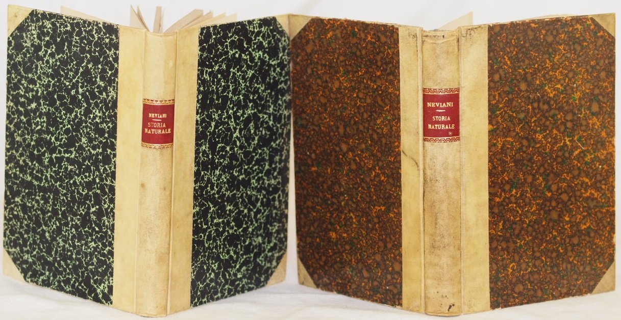 In 8. Dim. 20,5x14 cm. Pp. 251, 217. Interessante opera di storia naturale ad uso delle scuole secondarie scritta da Antonio Neviani Professore di storia naturale nel Regio Liceo R. Q. Visconti a Roma. L'opera è composta da due volumi. Il primo del 1905 interamente dedicato alla zoologia con descrizione e comparazione di vertebrati. Il secondo del 1907 di botanica con descrizione e comparazione di fanerogame angiosperme. Moltissime illustrazioni nel testo. Bella legatura in mezza pergamena con titolo su tassello in pelle al dorso. Qualche nota manoscritta. In ottime condizioni. Copertina in mezza pergamena con titolo su tassello al dorso in ottime condizioni generali con lievi usure ai margini e dorso. Legatura in buone condizioni. All'interno le pagine si presentano in ottime condizioni con rare fioriture. Applicazione di carta al margine inferiore del frontespizio del primo volume.Interesting work of natural history for the usage of secondary schools written by Antonio Neviani Teacher of natural history in Regio Liceo R. Q. Visconti in Rome. The work is made up of two volumes. The first one of 1905 is entirely dedicated to zoology with description and comparison of vertebrates. The second one of 1907 of botany with description and comparison of fanerogame angiosperme. Many illustrations in the text. Beautiful half parchment cover with spine title leather label. Some manuscripted note. In very good conditions. Half parchment cover with spine title leather label in very good general conditions slightly worn in the edges and spine. Binding in good conditions. Inside pages are in very good conditions with occasional foxings. Application of paper in the lower edge of the title page of the first volume.