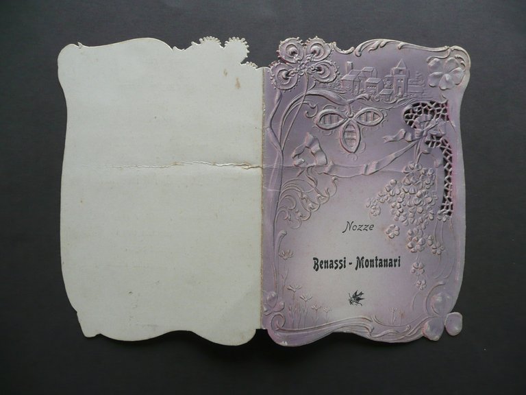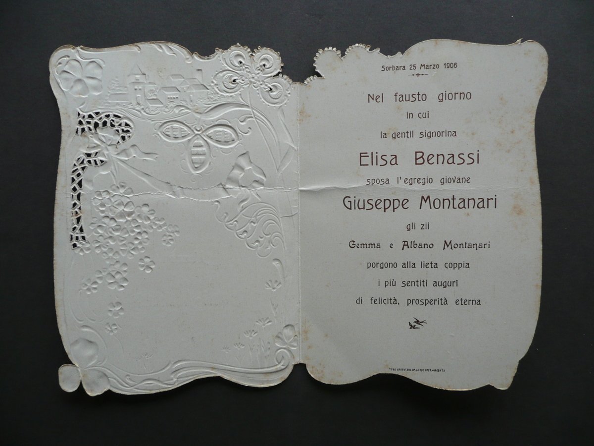 Biglietto, Biglietto di auguri Nozze Benassi - Montanari Sorbara (Modena) 25 Marzo 1906 Tip. Argentana della Soc. Oper., 1906, biglietto di auguri per nozze a stampa su bifolio in cartoncino sagomato, prima facciata traforata e con belle decorazioni in rilievo. Cm 15,5x10,5. Condizioni di conservazione Esemplare in buone condizioni con tracce d'uso, traccia di piega centrale, alcune decorazioni in rilievo con qualche minima abrasione, seconda e terza facciata (le due interne) con piccole lievi bruniture, terza facciata con una minima mancanza all'angolo inf. SC03.D9872 N