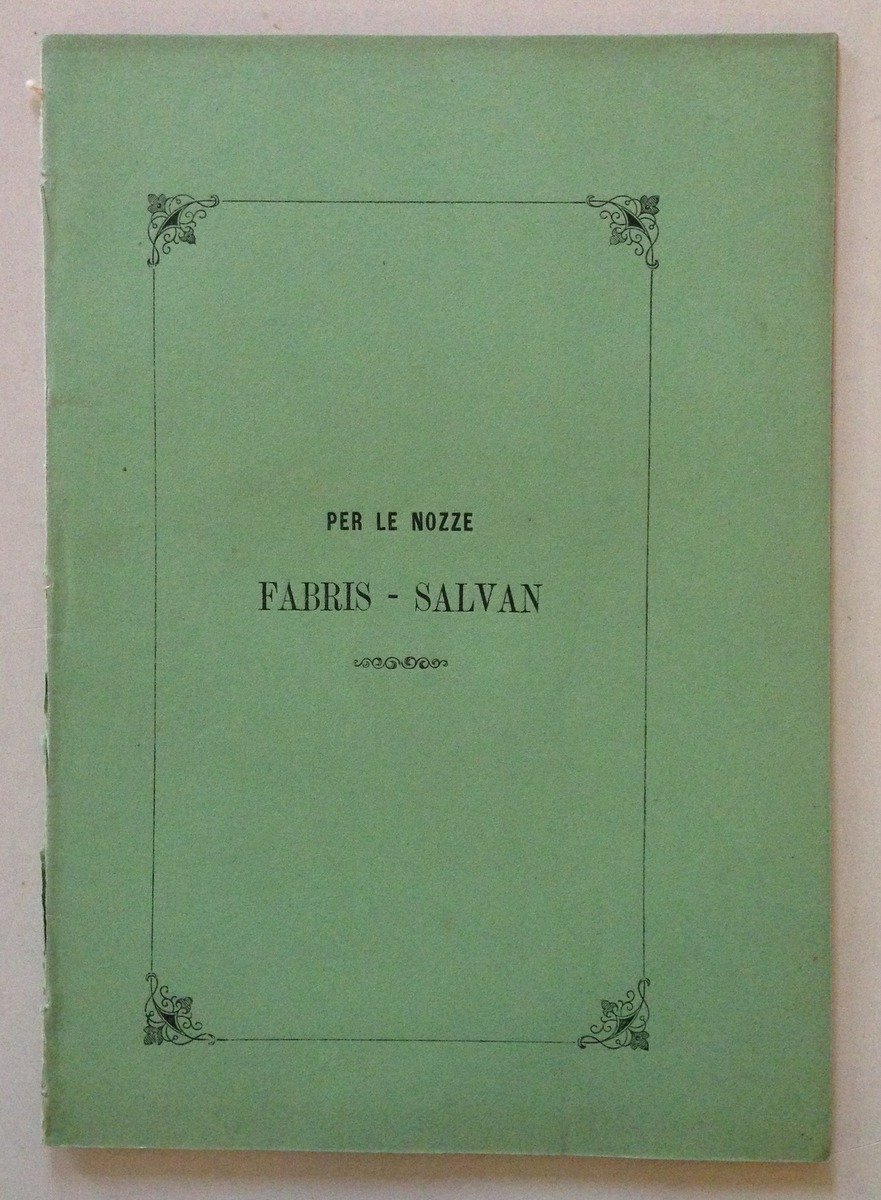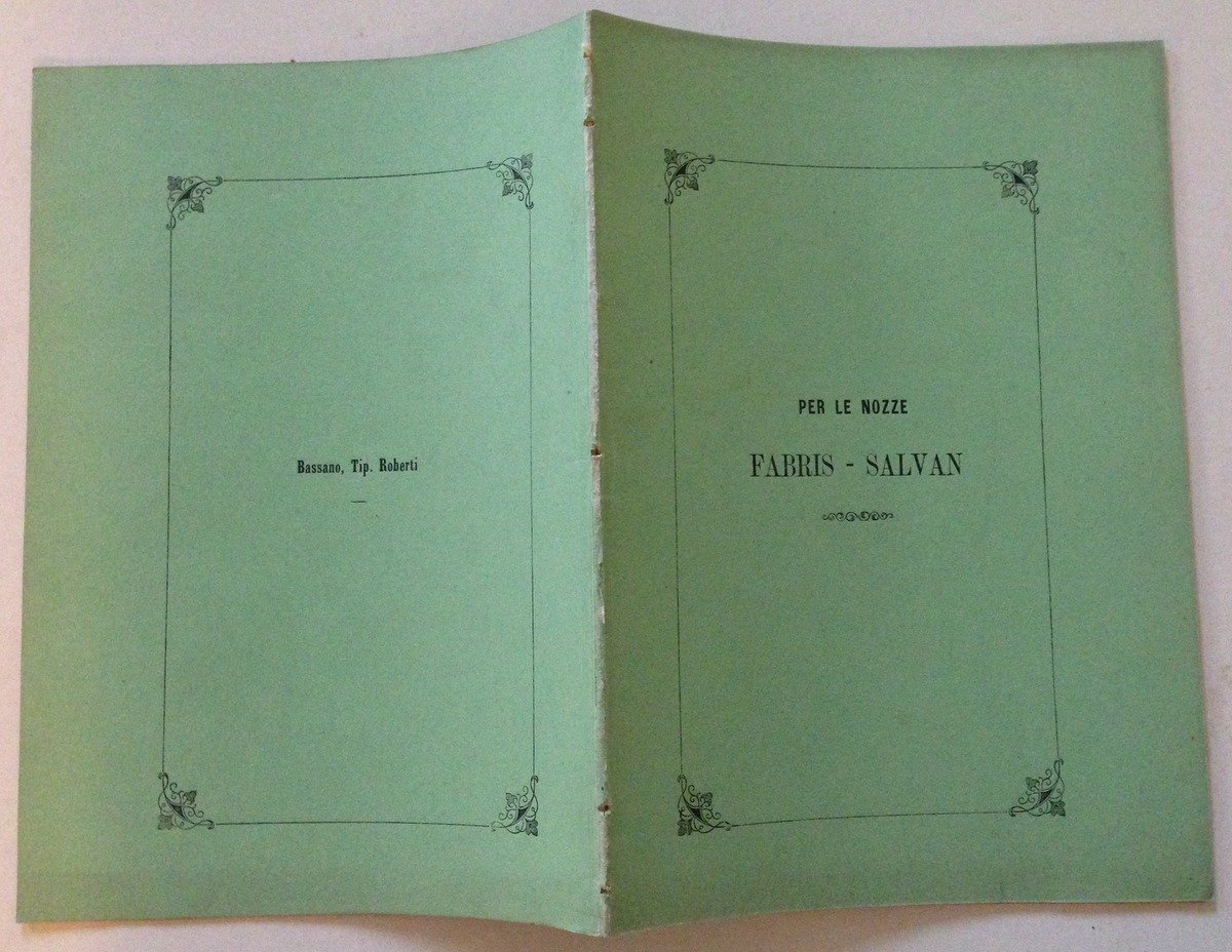 Opuscolo, Per le Nozze Fabris-Salvan Un passeggio solitario in dicembre nel contorno di Bassano Tipo-Litografia Roberti, Bassano, 1868; cm. 20.5x14.5, pp. 11; per le nozze Fabris-Salvan, Un passeggio solitario in dicembre nel contorno di Bassano, impressioni di Ambrogio Lugo; br. ed. Condizioni di conservazione Esemplare in buono stato con leggere tracce d'uso e del tempo; brossura editoriale con minime abrasioni al dorso; interni con minime fioriture. OPEB.3748 MT