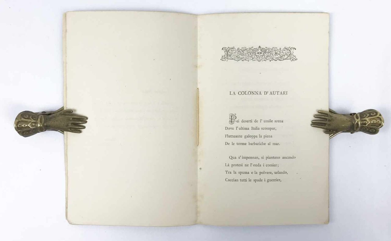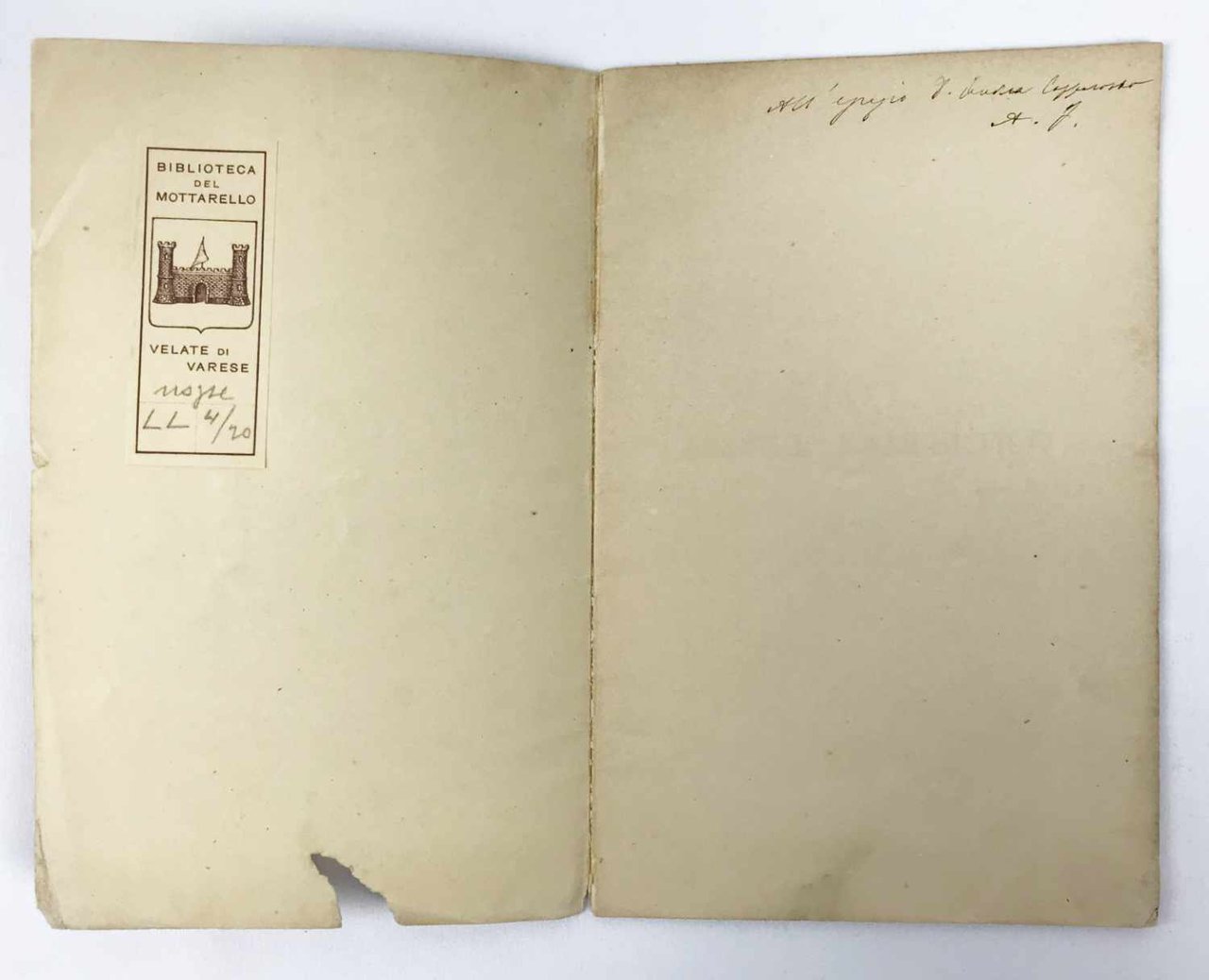 LIBROPrima edizione.CON AUTOGRAFO.Piccola mancanza al piatto al piede del piatto anteriore della brossura e piccolissimi strappi alla brossura, leggermente brunita. Interno ottimo. Ex libris «Biblioteca del Mottarello Velate di Varese» al contropiatto anteriore. Nota manoscritta «Fogazzaro» a matita al piatto anteriore. Dedica autografa dell’autore siglata «A. F.»Rarissima placchetta che contiene «La colonna d’Autari», poi ristampata nella sezione «Poesia dispersa» in appendice alla seconda edizione di «Valsolda» (Torino, 1886) e nelle «Poesie», (Milano, Baldini e Castoldi, 1908) con piccoli accorgimenti ortografici e di punteggiatura e una diversa lezione al verso 22, qui «Lo schiamazzo de' smerghi veloci», lì invece «Uno strider di smerghi veloci». L’ode trae spunto da un aneddoto leggendario narrato da Paolo Diacono nell’«Historia Langobardorum», dove si legge che il re longobardo Autari toccò con la lancia una colonna a pochi metri dalla riva nei pressi di Reggio Calabria e dichiarò che quello delimitato dalla colonna era il confine del regno dei Longobardi. La placchetta fu pubblicata in occasione delle nozze con Laura Balbi di Orazio Lampertico, figlio del letterato e politico Fedele Lampertico, zio della moglie di Fogazzaro e come lui vicentino e suo intimo amico, a cui è dedicata la placchetta: «Carissimo Fedele, quando c’è festa in casa tua, m’invito. Eccomi dunque a felicitare i tuoi novelli sposi e tutti di famiglia. A te, amante di memorie antiche, infliggo insieme alle congratulazioni questi versi archeologici». Molto raro: due sole copie nel catalogo SBN, entrambe in Veneto, terra d’origine degli sposi e dell’autore.