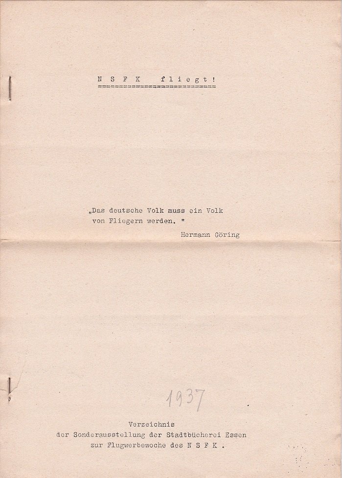 Das Original-Typoskript der Stadtbücherei Essen listet ein Verzeichnis von Buchtiteln rund um das Fliegen auf. Das Verzeichnis gehörte zu einer Sonderausstellung der Bücherei anläßlich der Flugwerbewoche des NSFK. Das Deckblatt hat einen handschriftlichen Eintrag welcher auf das Jahr 1937 verweist. Das Verzeichnis listet ca. 100 Titel und gliedert sich in folgende Bereiche: Vorkämpfer und Pioniere / Deutsche Flieger / Ausserdeutsche Flieger / Flieger am Feind / Die junge Mannschaft / Handbücher und Gesamtdarstellungen / Modellbau - Modellflug / Segelflugzeugbau - Segelflug / Sportfliegen und Motorflug / Luftwaffe / Sonderfragen der Luftfahrt / Nachtrag. Vereinzelt wurden Titel angestrichen, die jüngsten Titel datieren auf 1935-36 und reichen damit bis an die damalige Gegenwart heran. Unter den Titeln sind auch zahlreiche mit deutlich militärischem Bezug (Erster Weltkrieg, Luftwaffe), es ging hier also nicht um das zivile Segelfliegen. Interessante Archivalie zur Essener Sonderausstellung "NSFK fliegt!" und im Kontext einer nationalsozialistischen Flugwerbewoche!