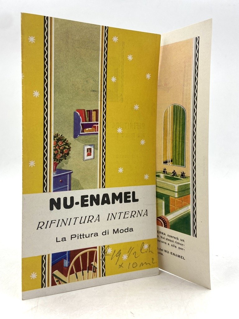 Pieghevole pubblicitario (aperto cm 17 x 27, chiuso cm 17 x 9) stampato a colori fronte e retro, promuove gli smalti NU-ENAMEL, con timbro della sede genovese sul piatto posteriore, immagini di interni e 6 campioni di colore. Annotazioni a matita sul piatto anteriore (vedi foto).