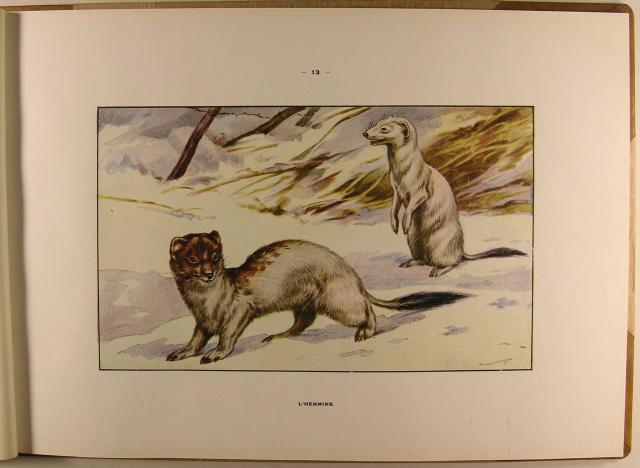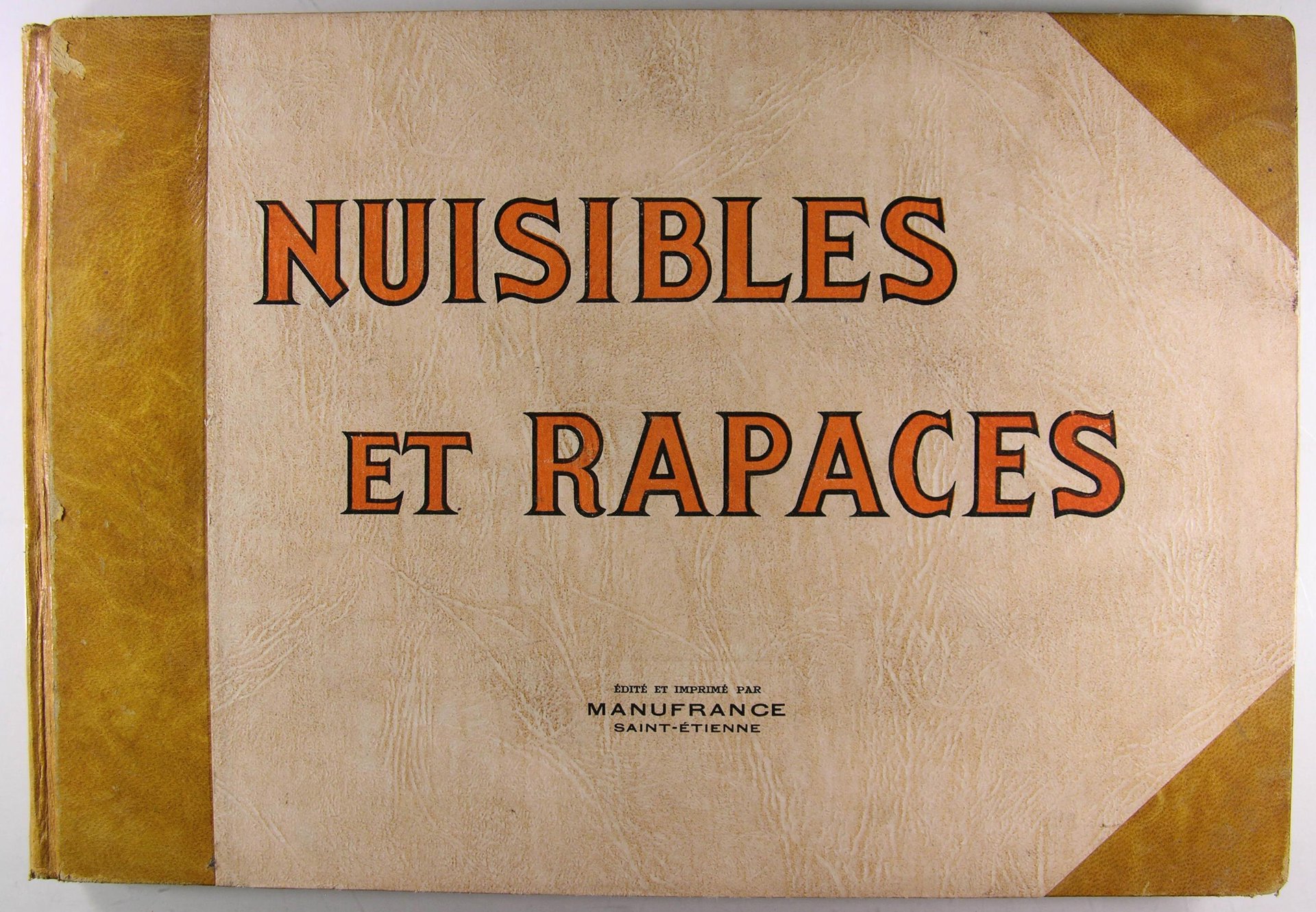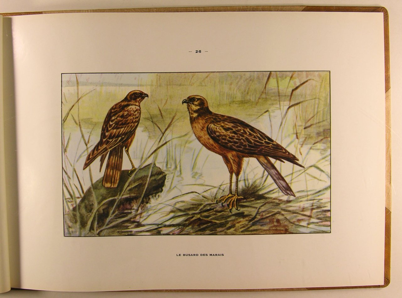 Edité et Imprimé par Manufrance. S. d. (1951). In/4 oblong, demi-basane fauve à coins. 49 pages, illustrations en couleurs. Cet album regroupe : Les bêtes fauves de toute taille qui habitent nos contrées, dont celles qui ont à peu près disparu comme l'ours et le loup. Les rapaces de toute nature : Diurnes de haut-vol et les rapaces nocturnes. Divers petits mammifères et oiseaux pillards de nids ou de récoltes. Les monographies sont dues à la plume de naturalistes éminents. Les planches en couleurs au nombre de 43 qui illustrent chacune d'elles, remarquables de vérité, sont l'oeuvre d'artistes animaliers de talent.