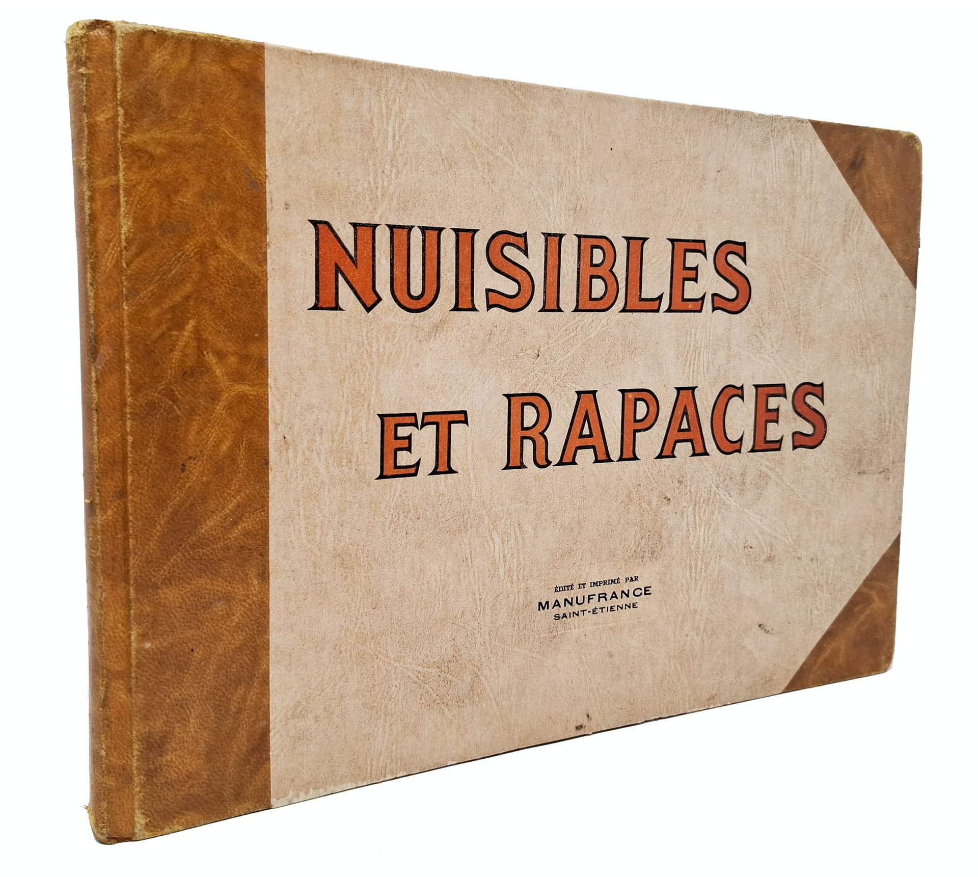 Splendido album, in formato 29,5 x 20,5 cm circa, composto da 43 cromolitigrafie a piena pagina raffiguranti animali selvatici 'nuisibles' e uccelli rapaci. Ogni tavola è protetta da un foglio in carta velina sul quale è stampato il testo, in lingua francese, che descrive le caratteristiche principali dell'animale raffigurato sulla tavola frontale. Al fondo del volume sono rilegate tre pagine pubblicitarie legate al mondo della caccia. Stato di conservazione:appena accennate e superficieli abrasioni sui bordi della brossura, sporadici e assolutamente non deturpanti piccoli ingiallimenti, qualche leggera stropicciatura ma, nel complesso, un esemplare decisamente ben conservato. Privo di firme d'appartenenza, timbri, annotazioni o altri segni nel testo.
