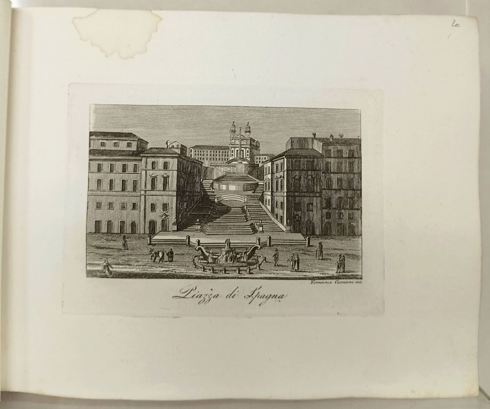 Macchia d'umido 1-2 cm nel margine superiore bianco di una ventina di tavole, qualche macchietta rossa, tavole ben inchiostrate, esemplare marginoso. Bella raccolta di vedute di alcuni dei luoghi più suggestivi di Roma e delle sue vicinanze.