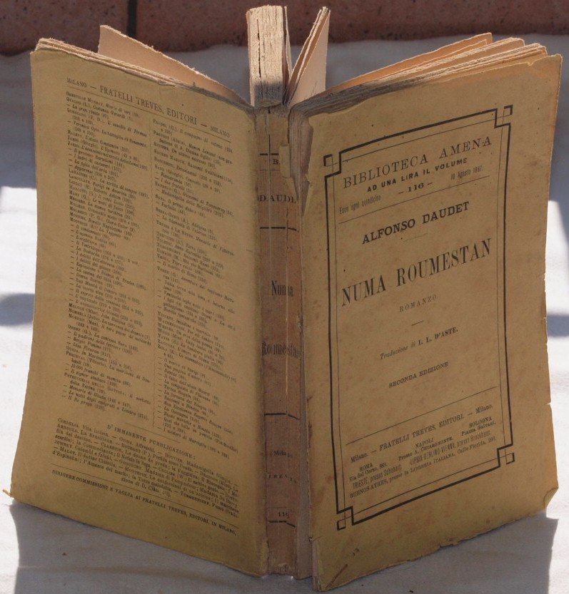 In 8. Dim. 19,5x13 cm. Pp. 307. Seconda edizione del 1887 della serie "Biblioteca Amena" di questo romanzo dello scrittore e drammaturgo francese Alphonse Daudet (1840-1898). Traduzione di D'Aste. L'opera è in un volume ed è completa. In discrete condizioni. Brossura editoriale in discrete condizioni generali con lievi usure ai margini e dorso; piatto anteriore in parte staccato. Legatura in discrete condizioni con rotture. All'interno le pagine si presentano in buone condizioni con rare fioriture. Second edition of 1887 of the series "Biblioteca Amena" of this novel by the french writer and dramawriter Alphonse Daudet (1840-1898). Translation by D'Aste The work is in one volume and it is complete. In fair conditions Editorial cover in fair general conditions slightly worn in the edges and spine; front plate partially detached. Binding in fair conditions with cracks. Inside pages are in good conditions with occasional foxings.