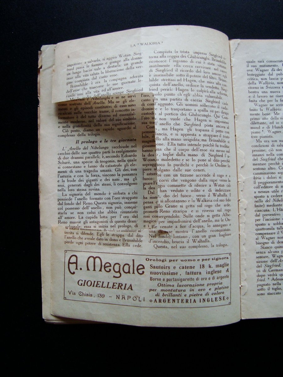 Brossura, La Maschera per la WALKIRIA" al San Carlo di Napoli Anno VI - n. 36 25 Dicembre 1910 Sta.Tip.S.Morano; 1910, cm 23x16,5, pp.22+ 10 pag con inserzioni pubblicitarie dell'epoca in apertura e chiusura di testo. Condizioni di conservazione. Esemplare in discreto stato di conservazione con tracce d'uso e del tempo; pieghetta all'angolo sup. della br.ant. e delle prime pag. ; margini con qualche piccolo strappetto; dorso con abrasioni, piccole mancanze e distacco dal corpo;pag.5/6 con mancanza di cira cm 10x9 per ritaglio di immagine(vedi foto); manca pag 7/8. SC03.D4939 blu "