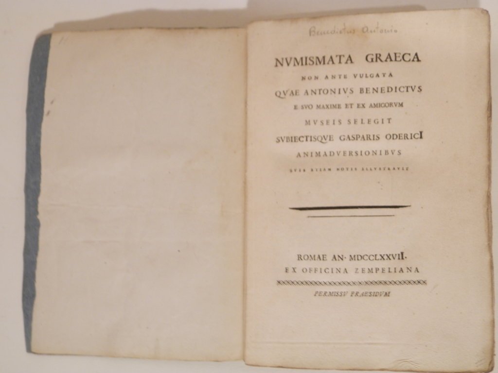 Numismata graeca non ante vulgata quae Antonius Benedictus e suo maxime et ex amicorum museis selegit subiectisque Gasparis Oderici animadversionibus suis etiam notis illustravi