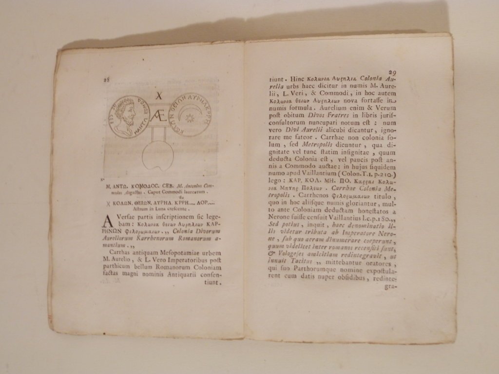 In-8°, cm 20, pp. VII, [1], 144, con incisioni raffiguranti monete all'interno. Brossura cartacea azzurra con titolo manoscritto su tassello al dorso (nastro trasparente non invasivo sul tassello). Piccoli segno d'uso alla costa, senza mancanze, nell'insieme esemplare in barbe, molto genuino e ben conservato. Non comune. Edizione originale e unica pubblicata, con le dotte note dell'abate Gaspare Oderici. L'autore fu gesuita e docente di letteratura greco-romana al Collegio Romano. . *** TUTTI I NOSTRI LIBRI SONO VISIBILI PREVIO CONTATTO MAIL O TELEFONO NELLA NUOVA SEDE DI MILANO: LIBRERIA COSMOPOLIS, VIA JOMMELLI, 22. ***